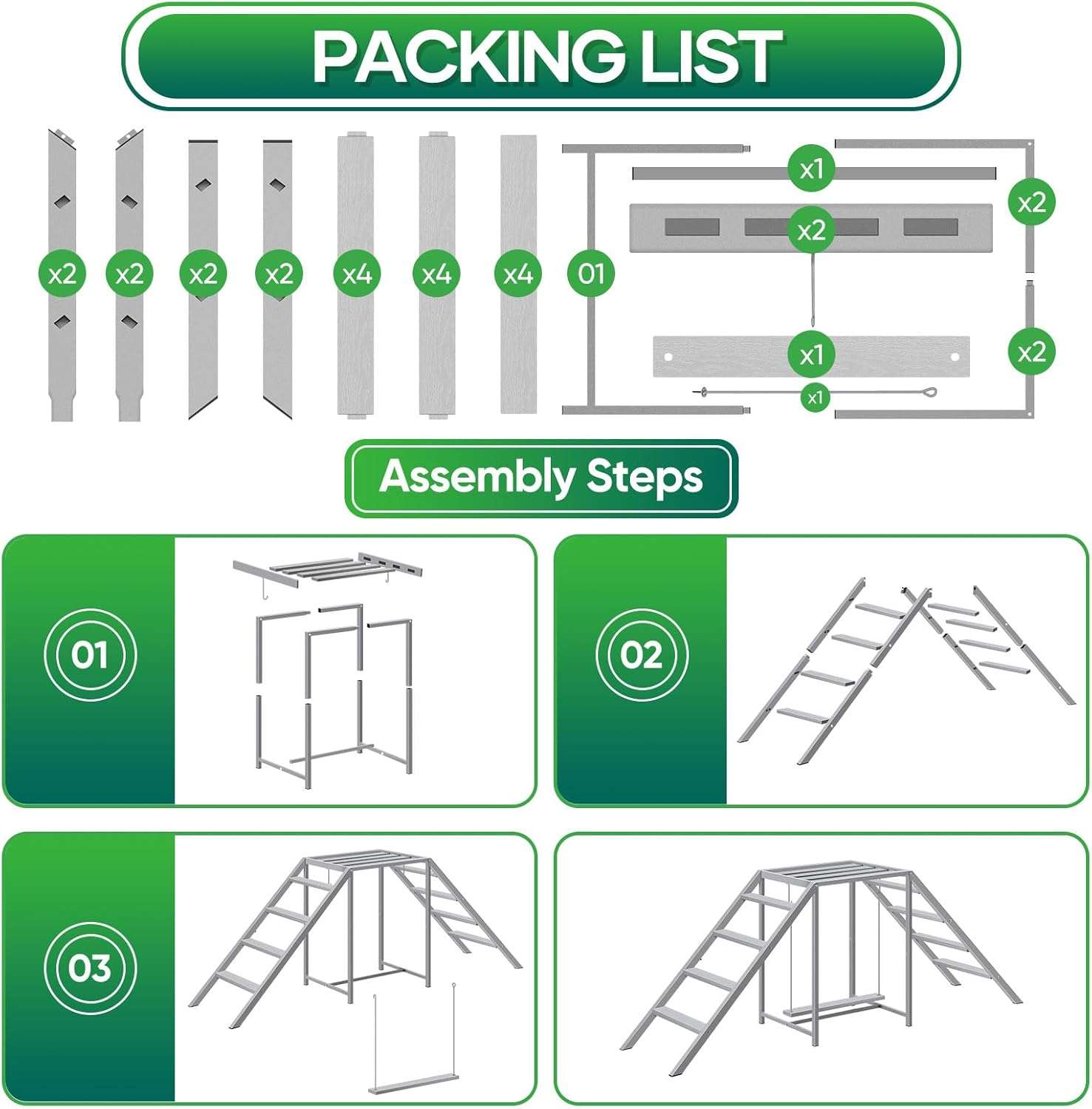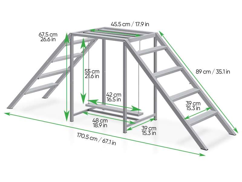 Componentes: Plataforma, columpio, 2 escaleras laterales y perchas