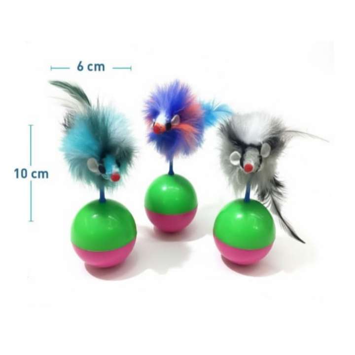 Caracteristicas y Dimensiones El producto presenta un atractivo diseno bicolor y tiene el tamano perfecto para que tu felino lo manipule con facilidad Base esferica de 5 centimetros de diametro Altura total aproximada de 11 centimetros Figura de raton superior cubierta de felpa y plumas