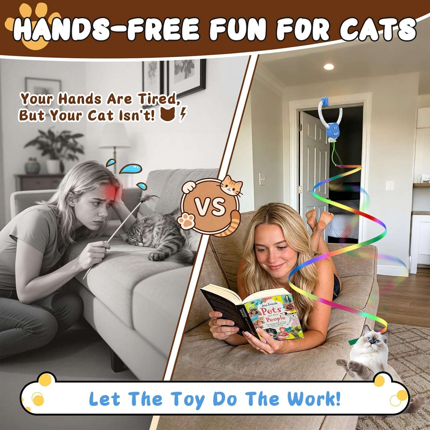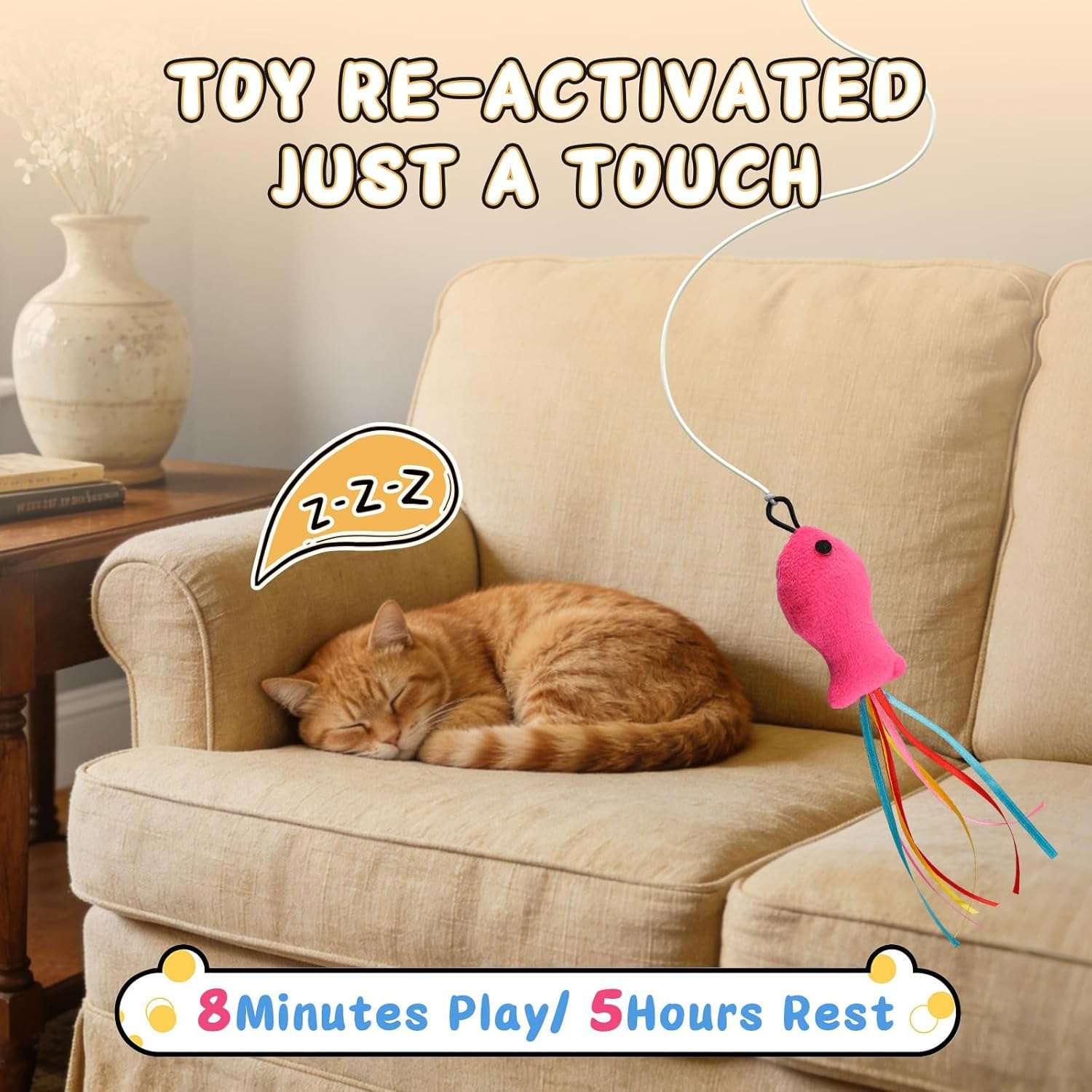 El dispositivo cuenta con un sistema de juego tactil inteligente que funciona automaticamente durante ocho minutos continuos por cada ciclo y luego entra en modo de espera para evitar la sobreestimulacion de su mascota Cuando su gato toca o tira de la cuerda elastica el juguete se reinicia al instante siendo un articulo perfecto para que juegue solo de manera segura