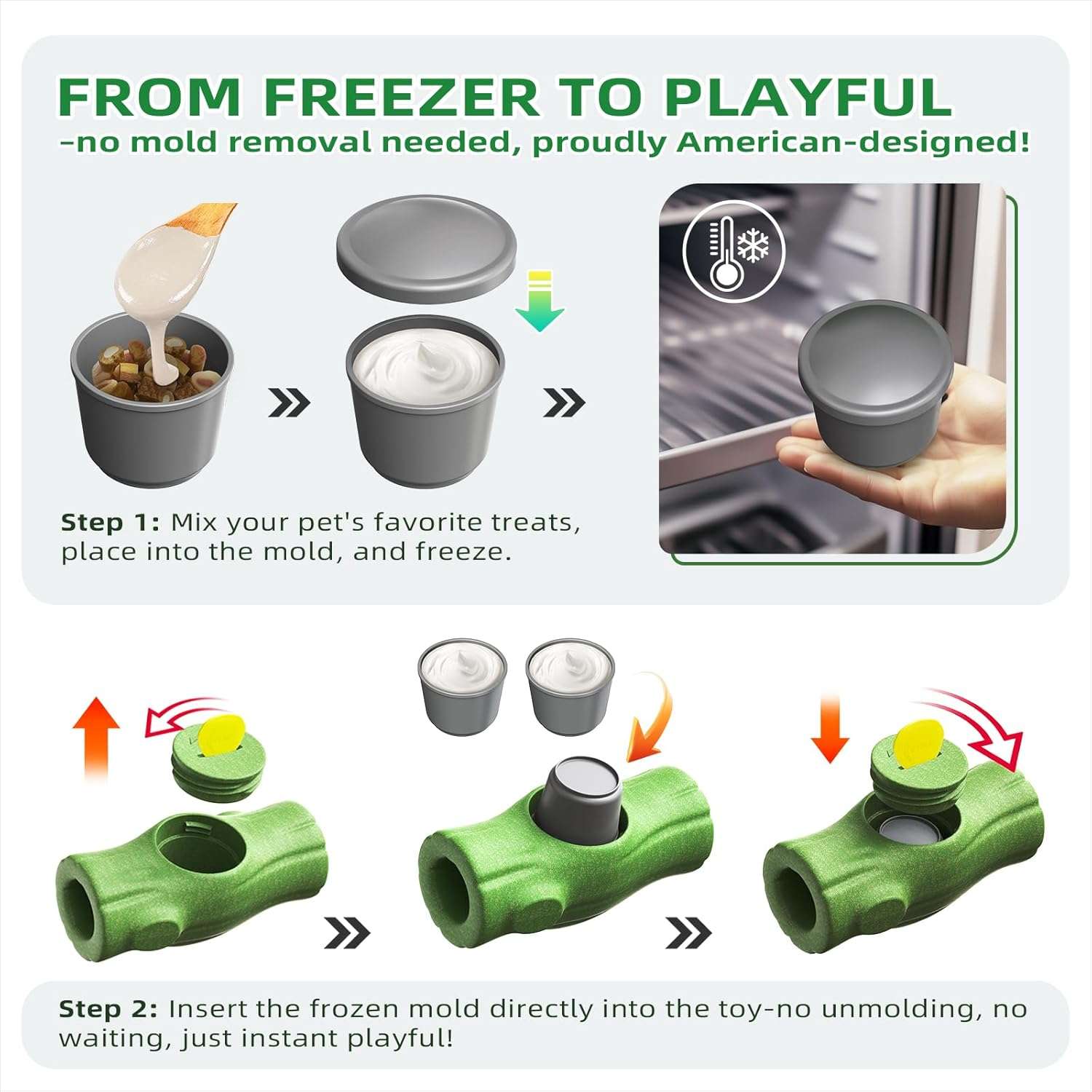 El sistema de este articulo es sumamente practico ya que incluye una taza interna que usted puede rellenar con alimentos como mantequilla de maní yogur o comida húmeda Solo debe colocar la taza en el congelador y una vez lista insertarla directamente en el juguete sin necesidad de desmoldar evitando cualquier tipo de desorden en su hogar