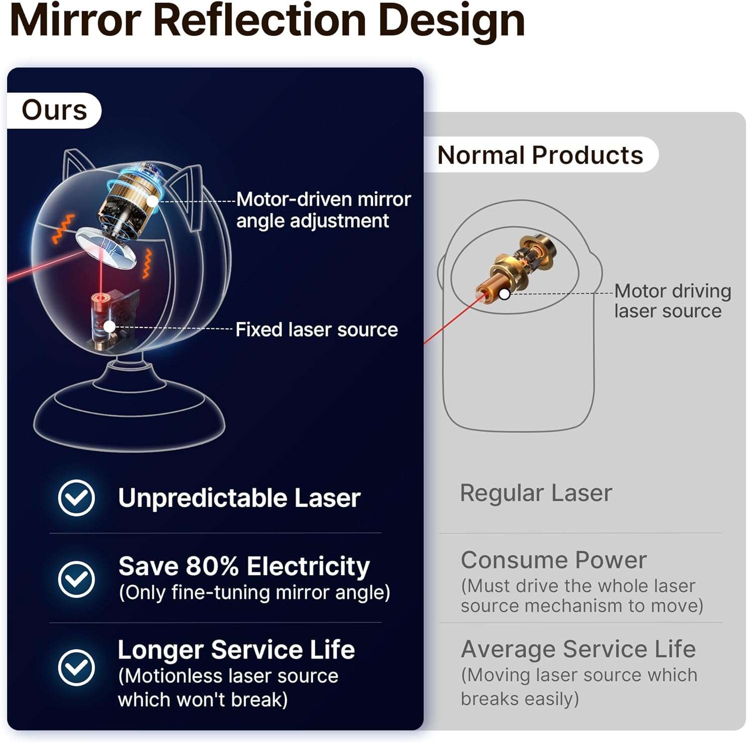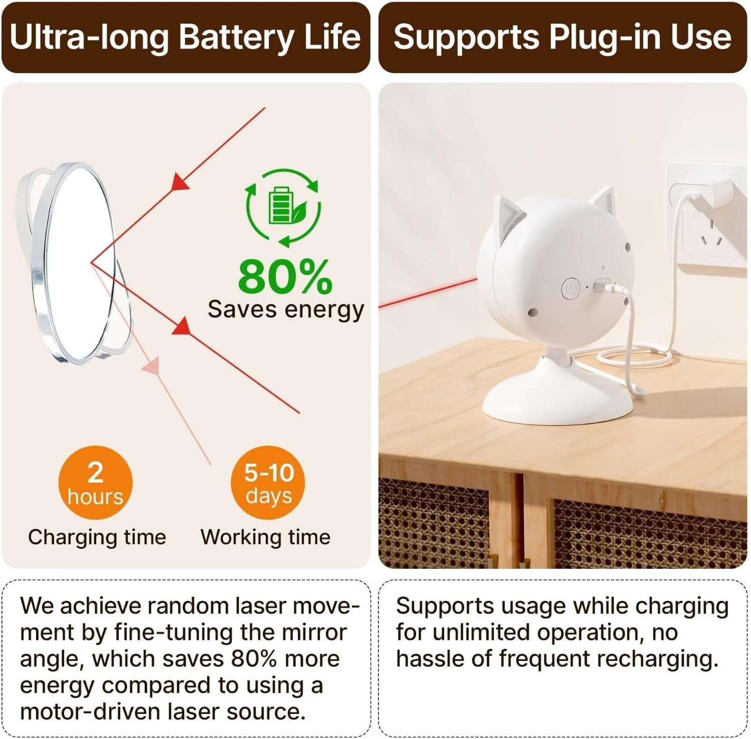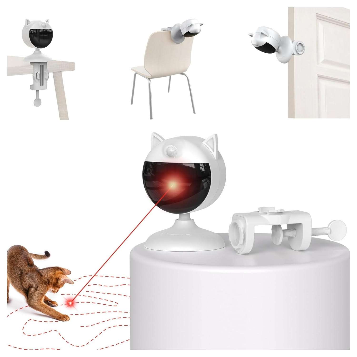Su practico diseño de doble abrazadera le permite fijar el articulo de manera segura en cualquier lugar de su casa desde sillas hasta puertas altas evitando que los gatos lo golpeen y lo boten accidentalmente interrumpiendo su juego Ademas gracias a su eficiente mecanismo de espejos ahorra un 80 por ciento mas de energia logrando que la bateria rinda entre cinco y diez dias de uso regular permitiendo tambien su funcionamiento ininterrumpido mientras esta conectado a la corriente electrica