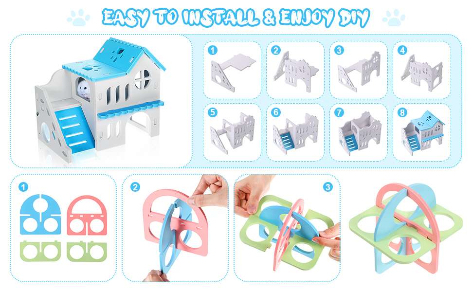 Tamaño adecuado: el tamaño de la casa de hámster es de 6.3 x 3.93 x 5.5 pulgadas, el puente arcoíris es de 5.5 x 2.75 x 3.15 pulgadas, el balancín es de 5.1 x 2.75 x 2.36 pulgadas, el columpio es de 3.5 x 2.8 x 5.5 pulgadas y el círculo de ejercicio es de 4.92 pulgadas. x 4.9 2 x 4.92 pulgadas; el juego contiene destornillador y tornillos, que son más estables y no se caen fácilmente, adecuado para hámsteres pequeños, ratones, jerbos y otras mascotas pequeñas