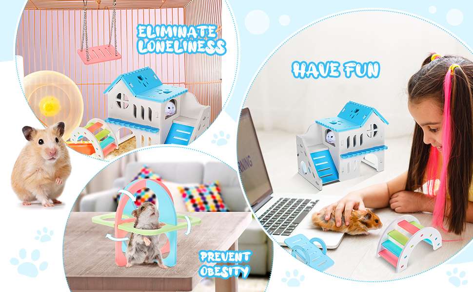 Recibirás: viene con 5 piezas de juguete para hámster, incluyendo 1 casa de hámster de doble capa, 1 balancín, 1 puente arcoíris, 1 columpio y 1 juguete de círculo de ejercicio para hámster; este juego de juguetes para hámster es adecuado para accesorios de jaula; diferentes juguetes harán que los hámsters se diviertan