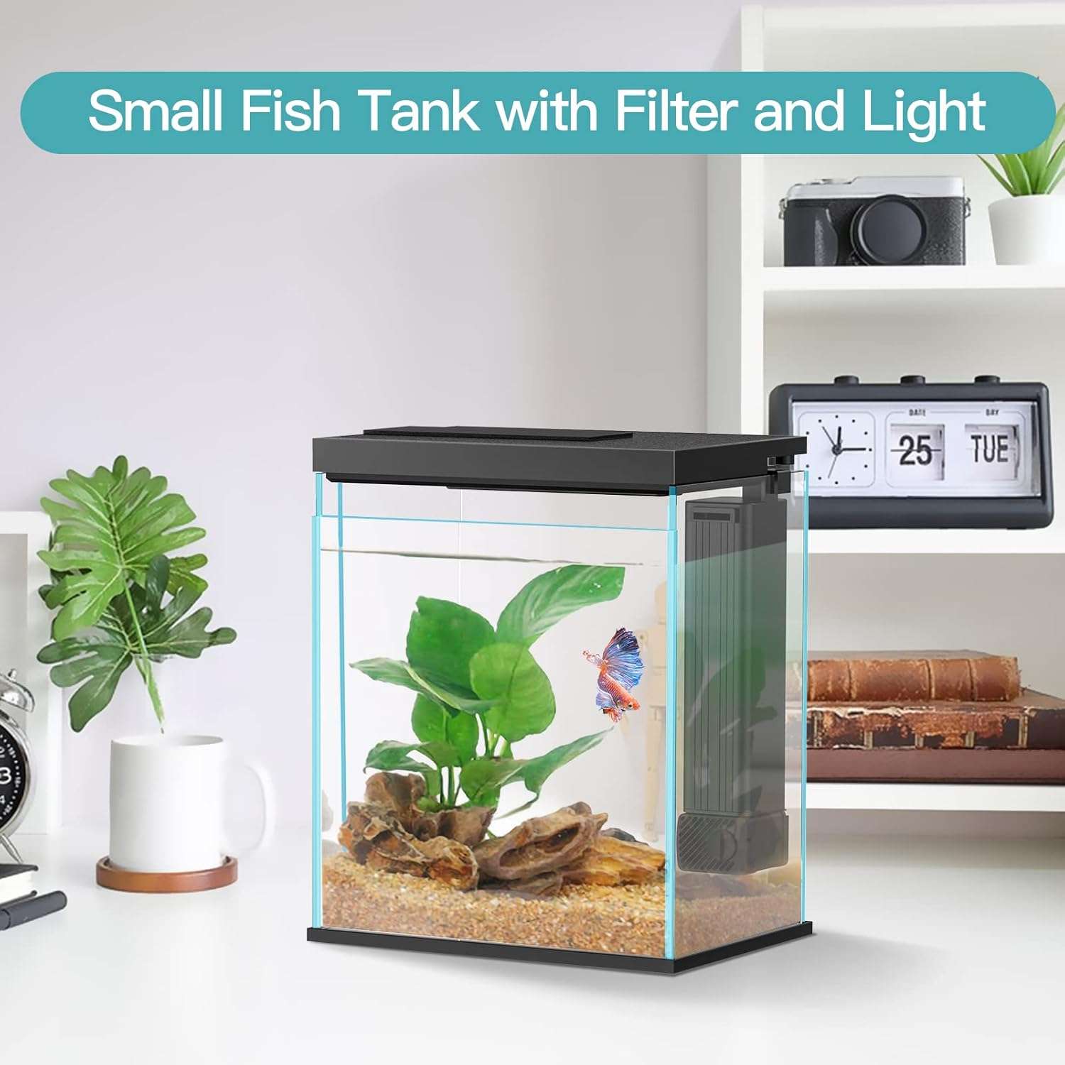 El mejor tanque de peces de arranque: pecera betta sin montaje, colgar el filtro se puede utilizar. El kit de pecera de inicio incluye una pecera de vidrio de 2 galones, una luz LED de 3 colores con control de encendido/apagado, un filtro de pecera, perfecto para mantener betta, camarones, peces dorados, también se puede utilizar como tanque de terapia.