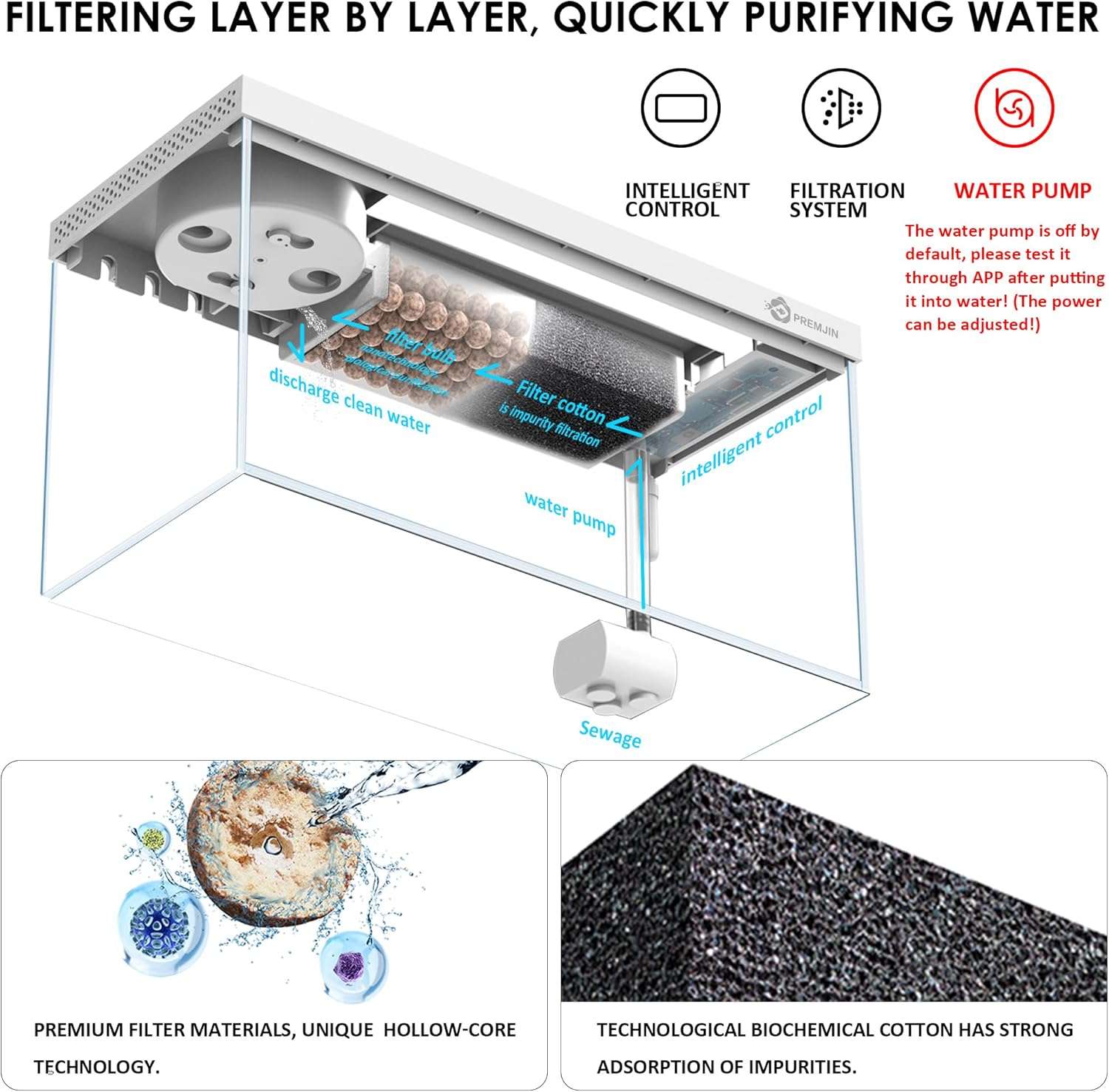 Sistema eficiente de crculación de agua: la bomba de agua inteligente PREMJIN para acuario se puede controlar mediante la aplicación para ajustar diferentes niveles de potencia de succión para realizar fácilmente tareas de filtración y limpieza. El sistema de filtración mejorado es más potente y fácil de reemplazar el cartucho de filtro. Las salidas de oxigenación en el lateral aseguran suficiente oxígeno para los peces. Además, está equipado con un sensor de temperatura incorporado. Puede verificar la temperatura del agua en cualquier momento y en cualquier lugar a través de la aplicación.
