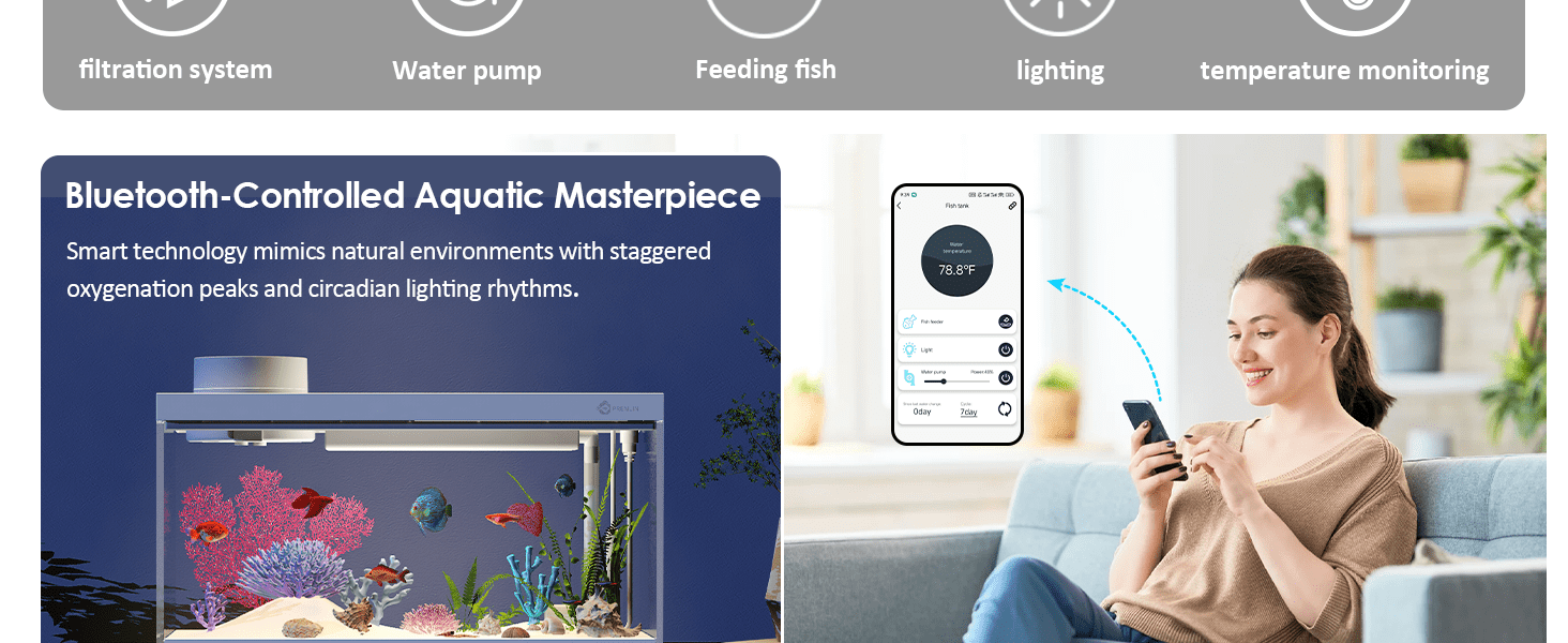 Alimentador automático inteligente: pecera PREMJIN equipada con un alimentador automático que te permite programar horarios precisos de comidas a través de una aplicación, perfecto para vacaciones o estilos de vida ocupados. Capacidad para hasta 3 meses de comida y el diseño a prueba de humedad evita que los alimentos se aglomeren. Imprescindible para los propietarios de tanques que desean cuidar sus peces betta sin preocupaciones.