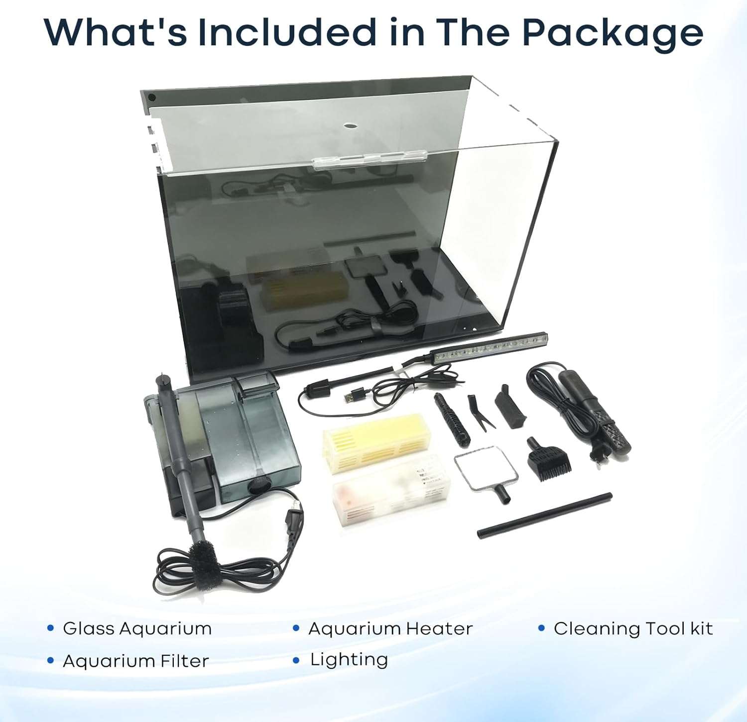 KIT DE ACUARIO TODO EN UNO, REPLETO DE VALOR: viene completo con tanque de vidrio flotante HD de 10 galones, calentador, filtro Hang on Back, luz LED, juego de herramientas de limpieza 5 en 1, no se necesita compra adicional.