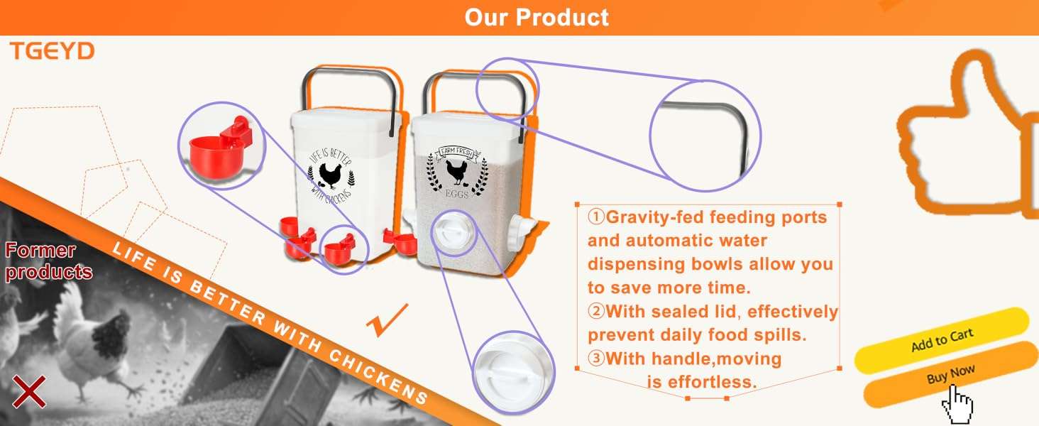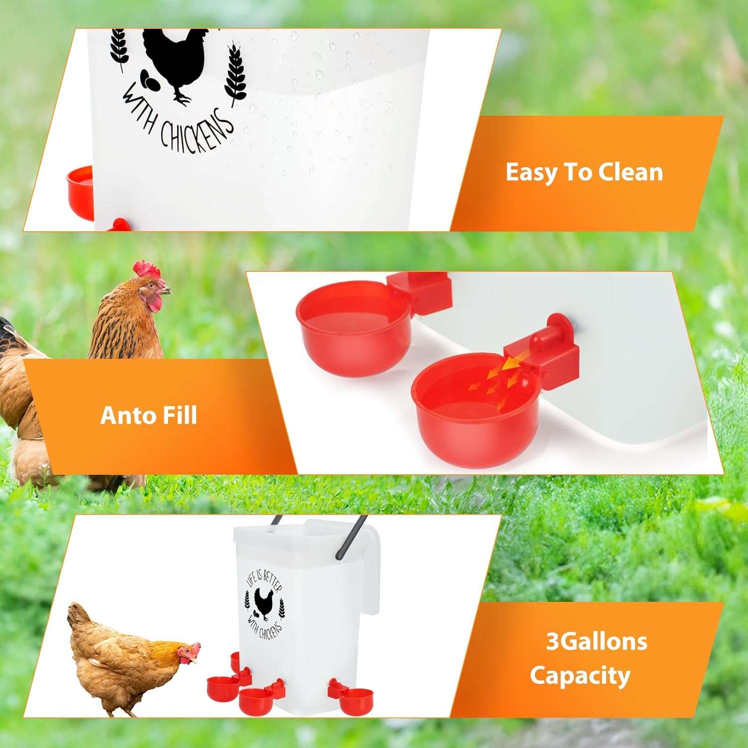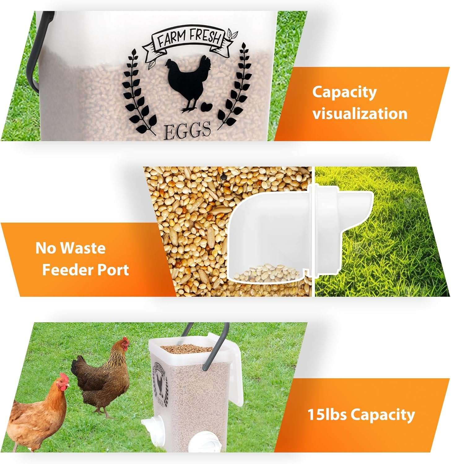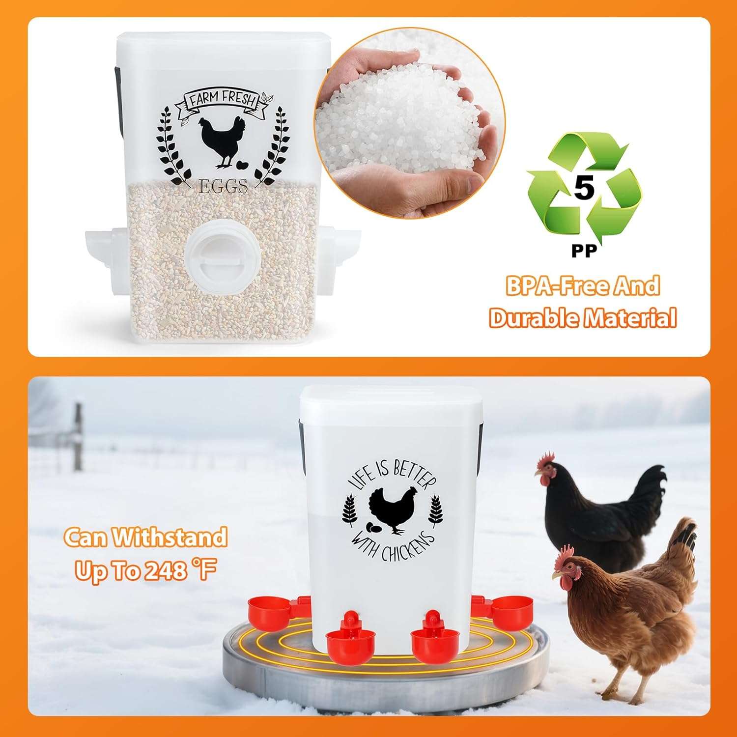 El comedero cuenta con puertos extendidos hacia abajo que evitan que las aves derramen el grano, manteniendo el suelo limpio y libre de roedores. El bebedero utiliza tazas automáticas que reducen el goteo. Además, el material plástico de alta resistencia está diseñado para climas fríos: su base plana permite colocarlo sobre almohadillas térmicas para descongelar el agua en inviernos helados sin dañar el recipiente.