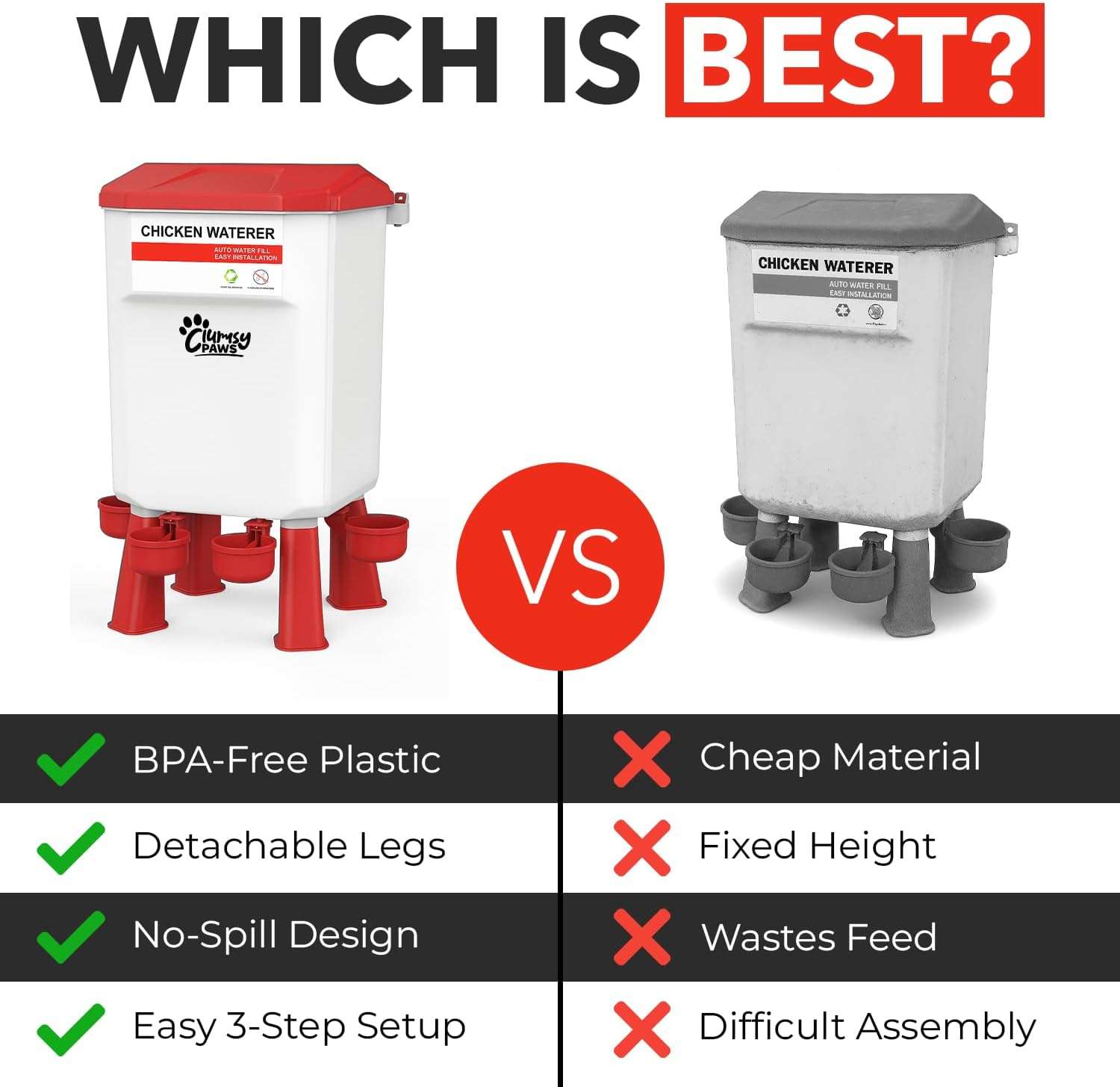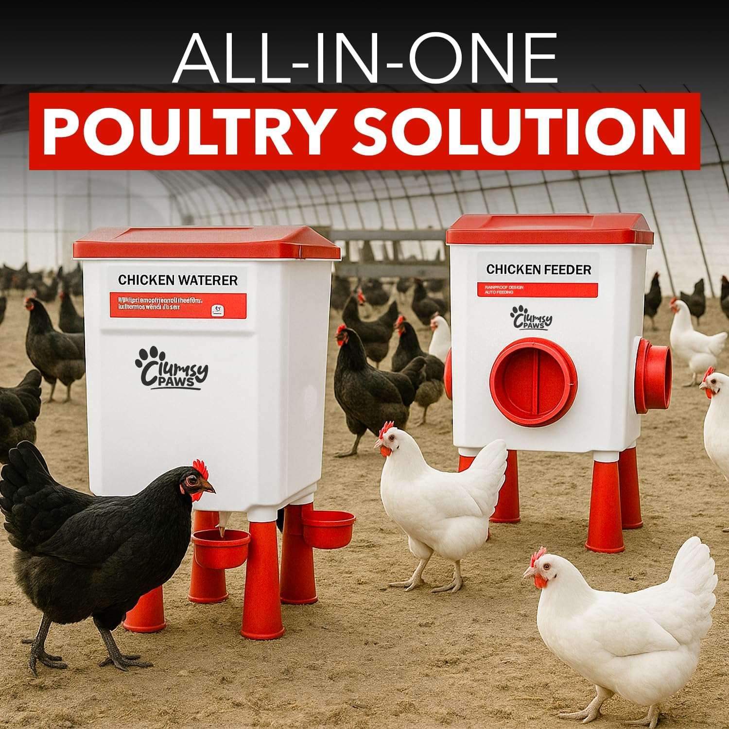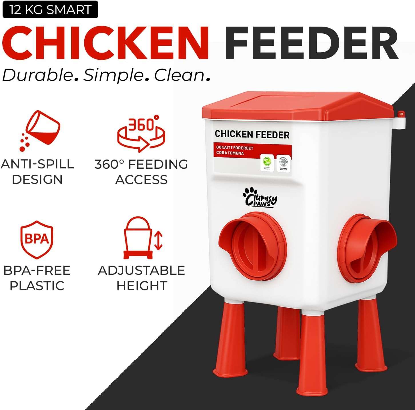 Fabricado para resistir el clima de Chile. Hecho de plástico estabilizado a los rayos UV, este kit soporta el sol intenso sin tostarse ni decolorarse, y resiste los picoteos constantes. El diseño del plato cuenta con un sistema anti-derrame eficiente que minimiza la pérdida de alimento y evita que el agua salpique, manteniendo la cama del gallinero seca, limpia y libre de malos olores.