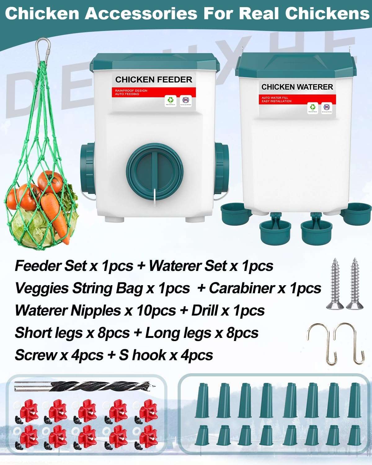 Contenido del Kit: 1 Comedero + 1 Bebedero + 1 Red de Verduras + 10 Niples extra.