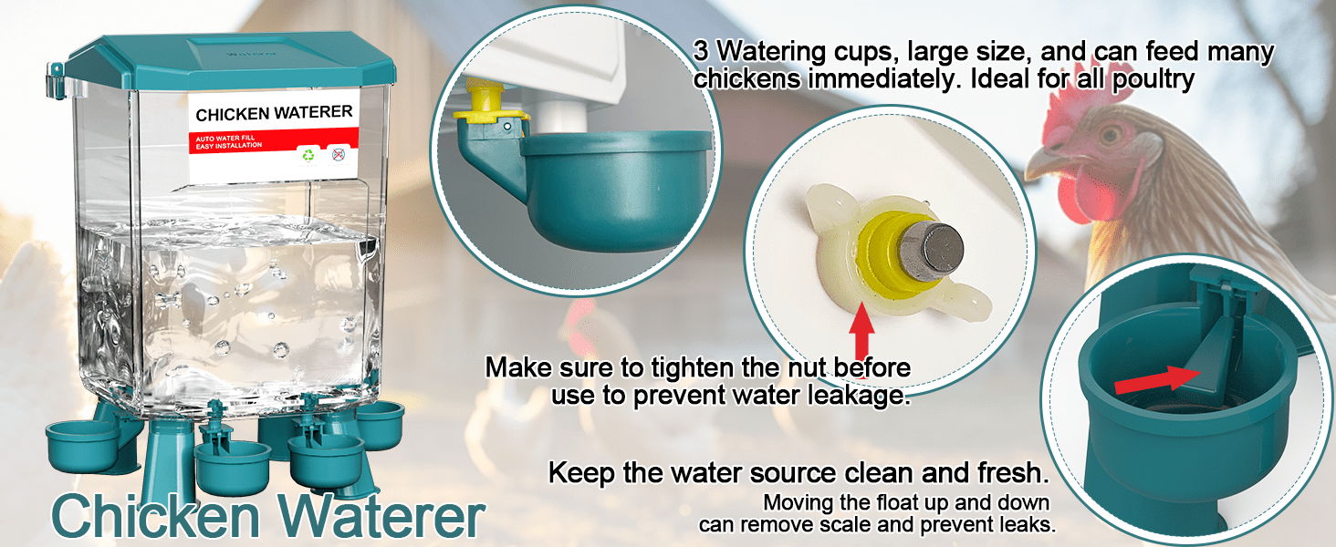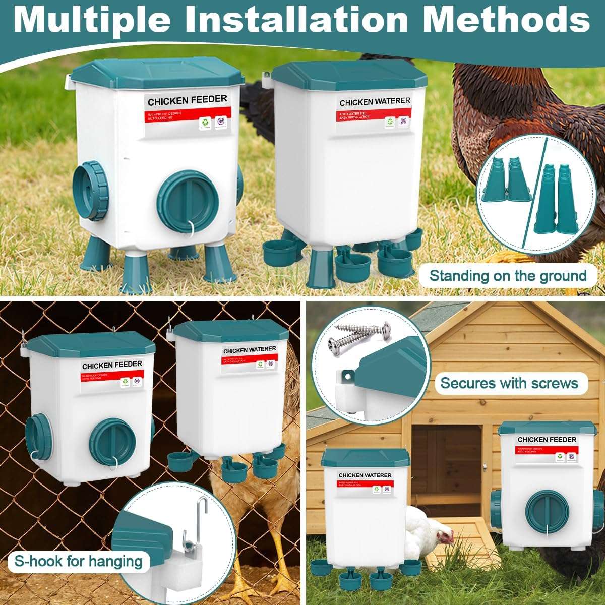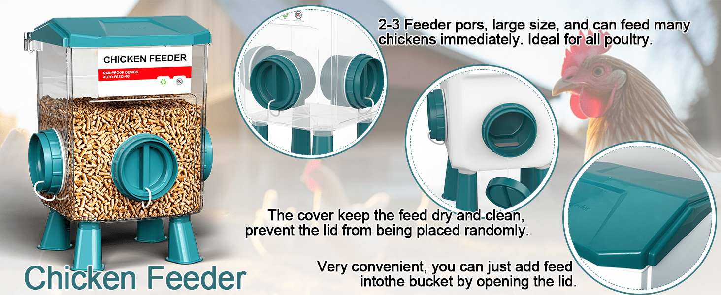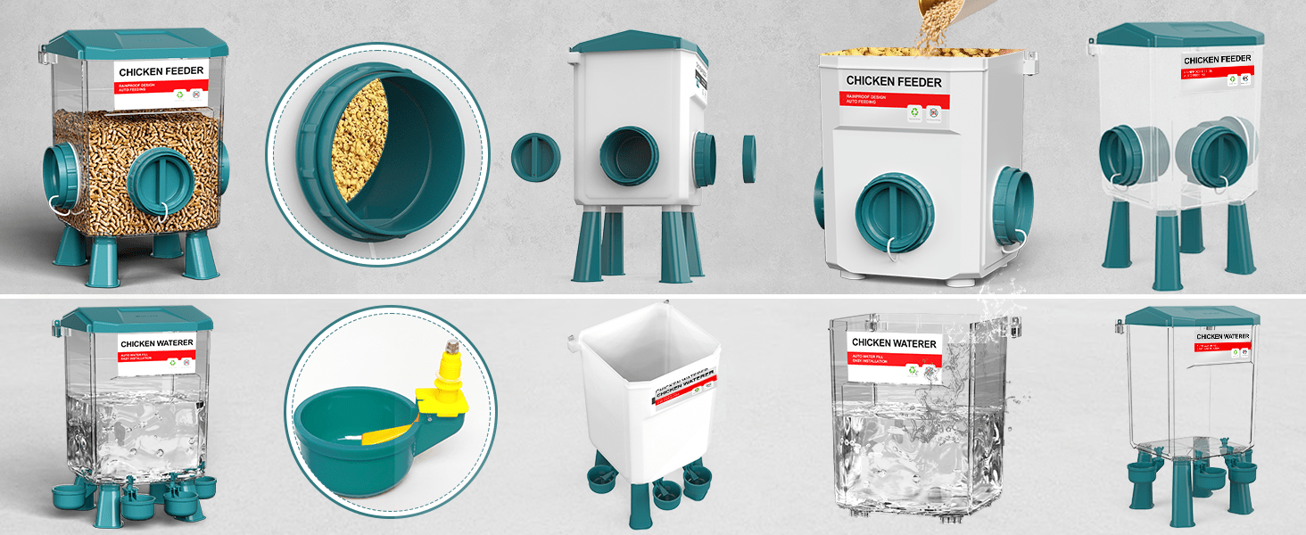 La salud de tus gallinas es lo primero. Ambos recipientes incluyen juegos de patas desmontables (largas y cortas) que elevan la comida y el agua del suelo, evitando que se ensucien con tierra, viruta o heces. El comedero cuenta con puertos con visera que protegen el grano de la lluvia, manteniendo el alimento seco y fresco en exteriores. Úsalos con patas, en el suelo o colgados según tu espacio.