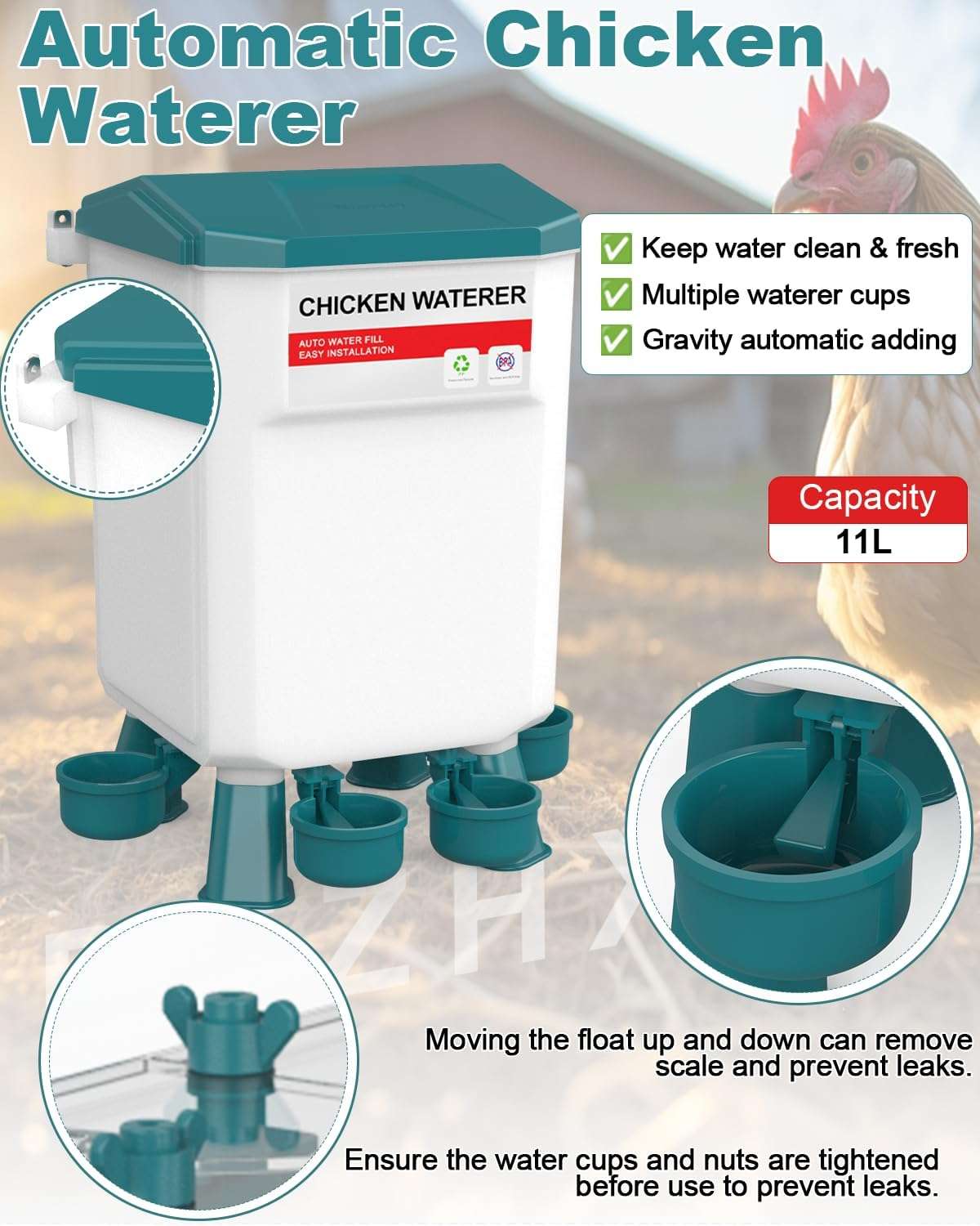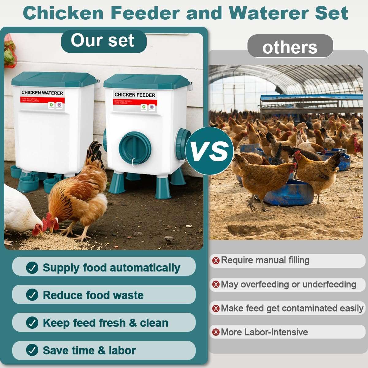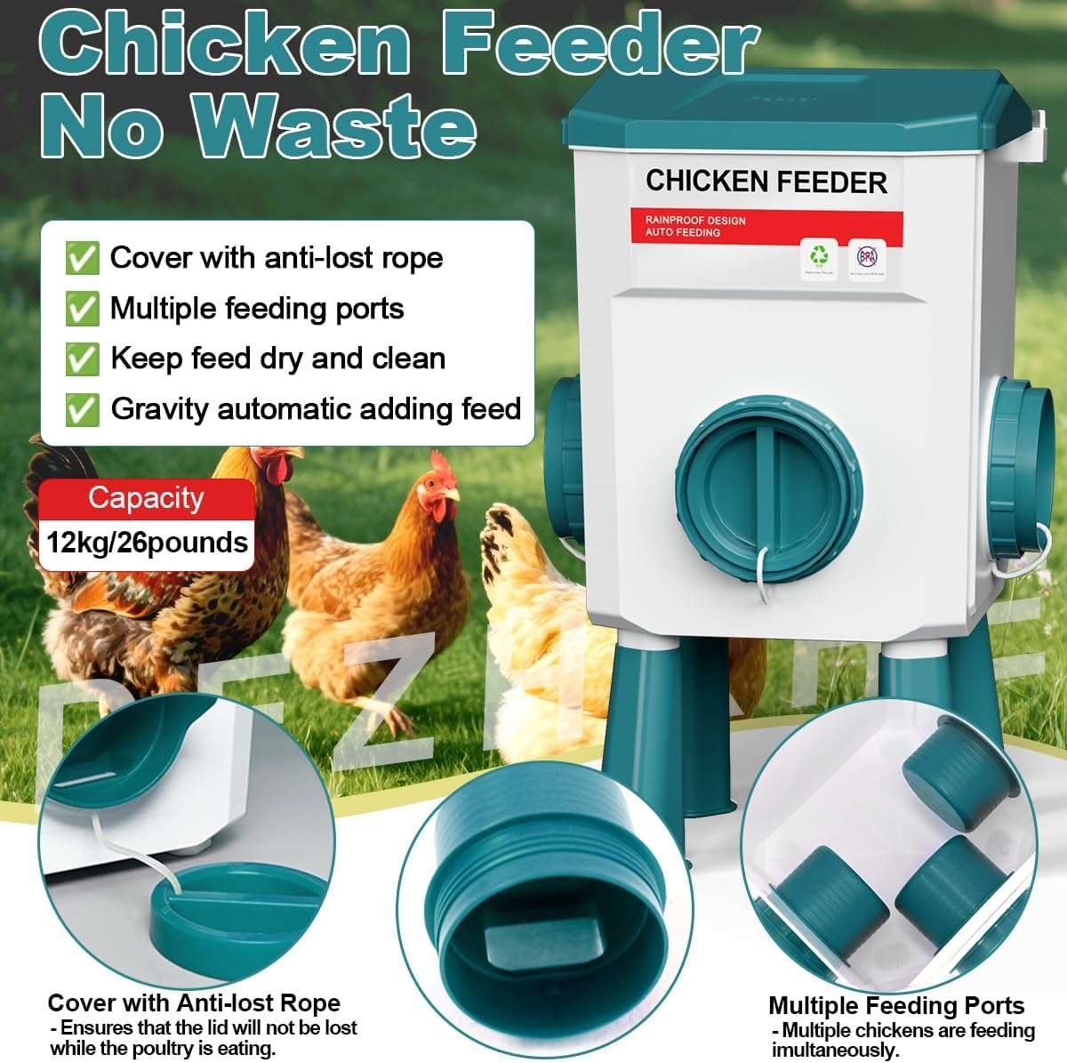 La salud de tus gallinas es lo primero. Ambos recipientes incluyen juegos de patas desmontables (largas y cortas) que elevan la comida y el agua del suelo, evitando que se ensucien con tierra, viruta o heces. El comedero cuenta con puertos con visera que protegen el grano de la lluvia, manteniendo el alimento seco y fresco en exteriores. Úsalos con patas, en el suelo o colgados según tu espacio.
