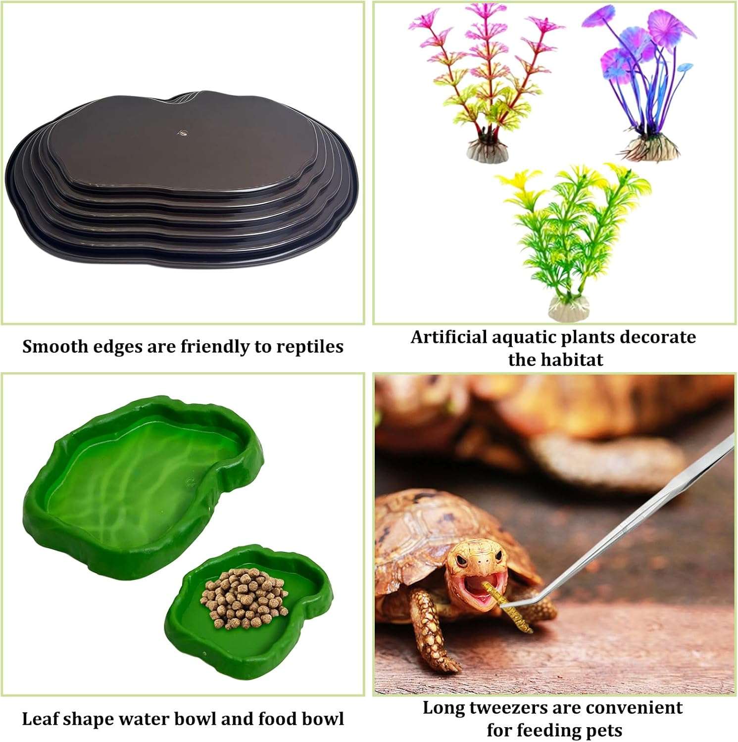 Juego de siete reptiles: un cuenco de agua para reptiles para remojar; dos cuencos de comida y agua para reptiles; tres plantas acuáticas artificiales y una pinza. El cuenco de agua de tortuga con rampa viene con accesorios para facilitar la alimentación y decoración del hábitat