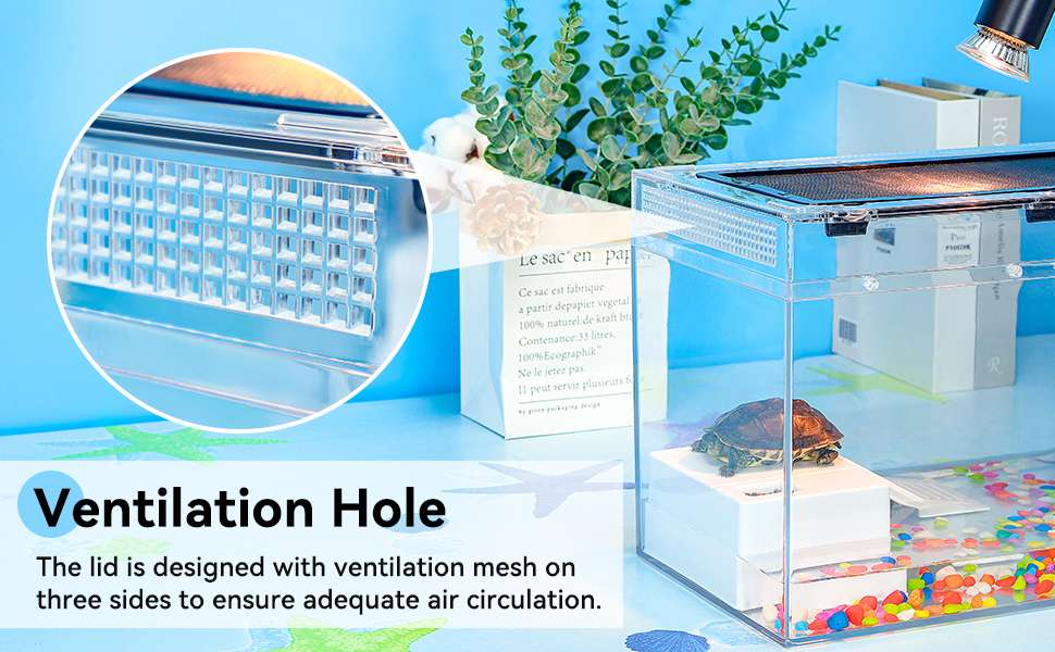 Sistema de ventilación avanzado: este hábitat de tortuga está diseñado con un sistema de ventilación 3D para garantizar un flujo de aire continuo, evitando la congestión y creando un ambiente saludable y cómodo en tu kit de tanque de tortugas.
