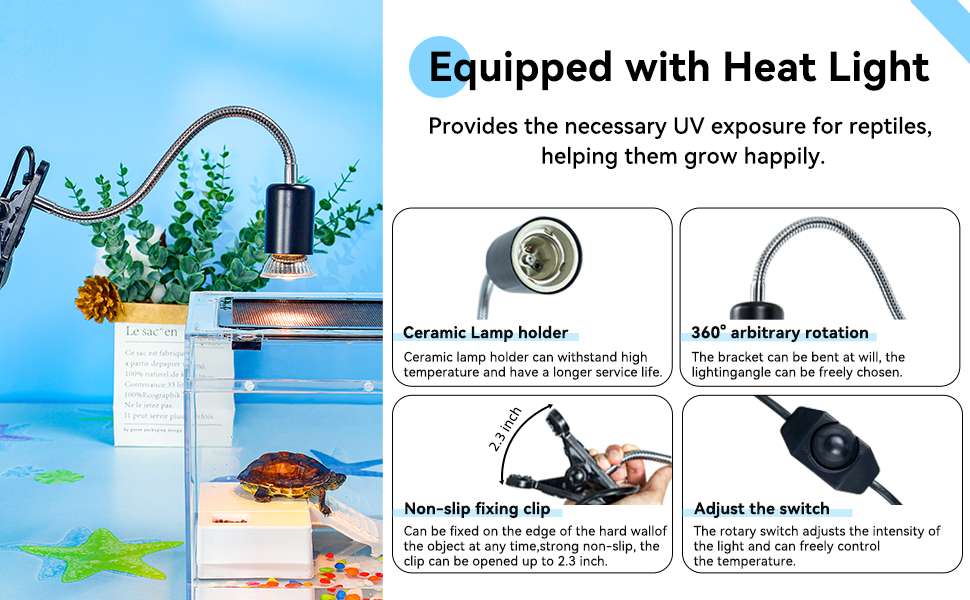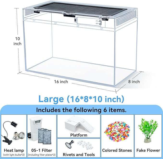 【Juego completo de accesorios】: el kit de tanque de tortuga viene con una lámpara de calefacción y un filtro, proporcionando todos los elementos esenciales necesarios para mantener un acuario de tortugas próspero. Esta configuración completa de recinto de tortugas hace que sea fácil crear la casa de tortugas perfecta para tu mascota.