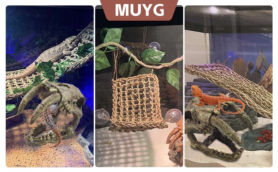 Material de calidad : accesorios para tanque de calavera con material de resina de alta calidad, bien hecho, natural y hermoso, duradero y no dañará a tu mascota. Tejida a mano con materiales naturales de algas marinas, la hamaca de dragón barbudo es suave, resistente y duradera. La planta trepadora Gecko está hecha de material PP de alta calidad, por lo que puedes utilizarlas con confianza y dejar que agreguen un poco de color natural a tu terrario de mascotas