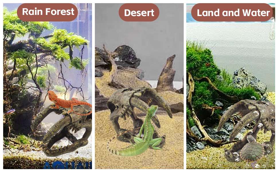 Múltiples ocasiones: las calaveras para tanque de serpiente son adecuadas para una variedad de escenas. Como cráneo de escondite de reptiles, no solo es una verdadera forma de cueva única en la pecera, sino que también puede coincidir con la selva tropical, el desierto y el paisaje del acuario
