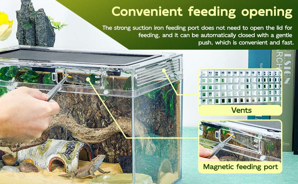 Práctico puerto de alimentación: con un potente puerto de alimentación magnético, este tanque de reptiles simplifica el proceso de alimentación de tu gecko, serpiente o lagarto. No hay necesidad de levantar la tapa: un suave empuje cierra el puerto automáticamente, asegurando tanto la facilidad de uso como la frescura de la comida de tu mascota.