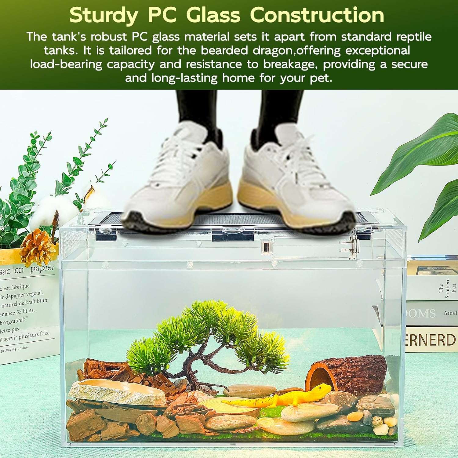 Construcción de vidrio de policarbonato duradero: el robusto material de vidrio de policarbonato del tanque lo distingue de los tanques de reptiles estándar. Está diseñado para el dragón barbudo, ofreciendo una capacidad de carga excepcional y resistencia a la rotura, proporcionando un hogar seguro y duradero para tu mascota.