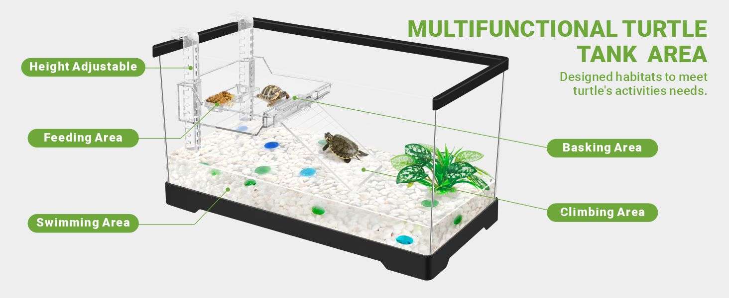 Fácil de usar y fácil de limpiar: los tanques de tortuga GOZILLA están diseñados con un drenaje inferior, al sacar el tapón de goma permite que el agua drene a través de un pequeño orificio en el borde inferior. Hay un área de bricolaje extraíble gratuita, puedes utilizar nuestras piedras y árboles de colores incluidos para decorar el paisaje del acuario de tortugas.