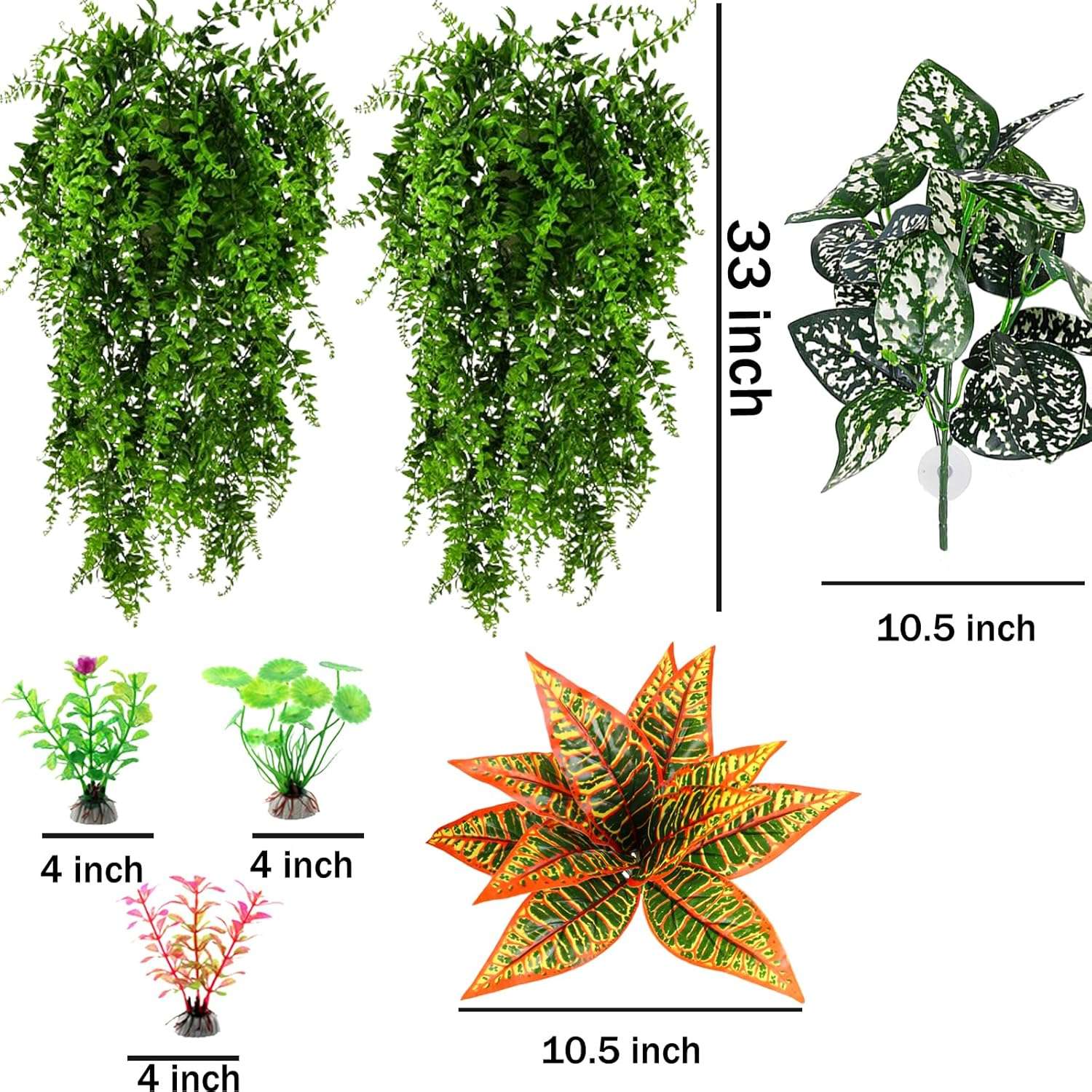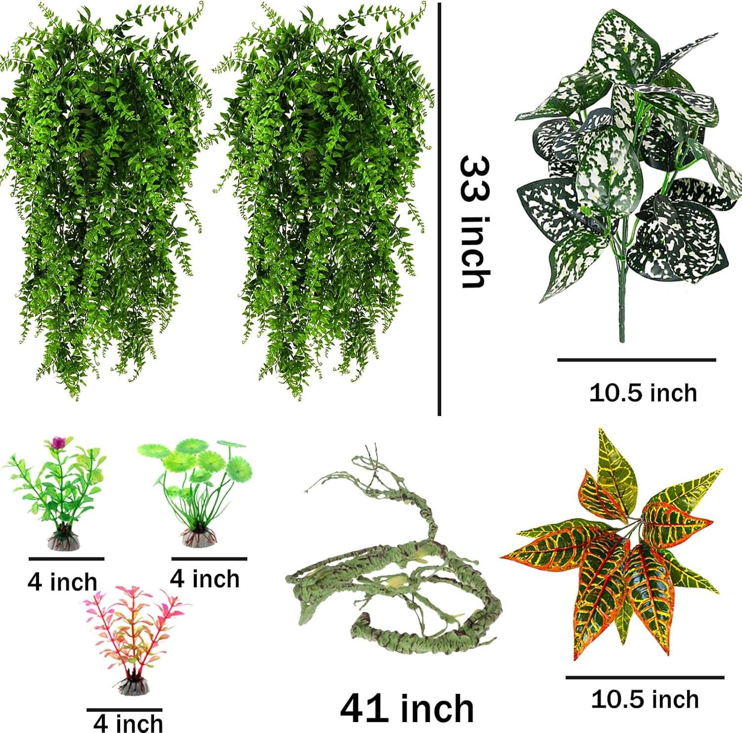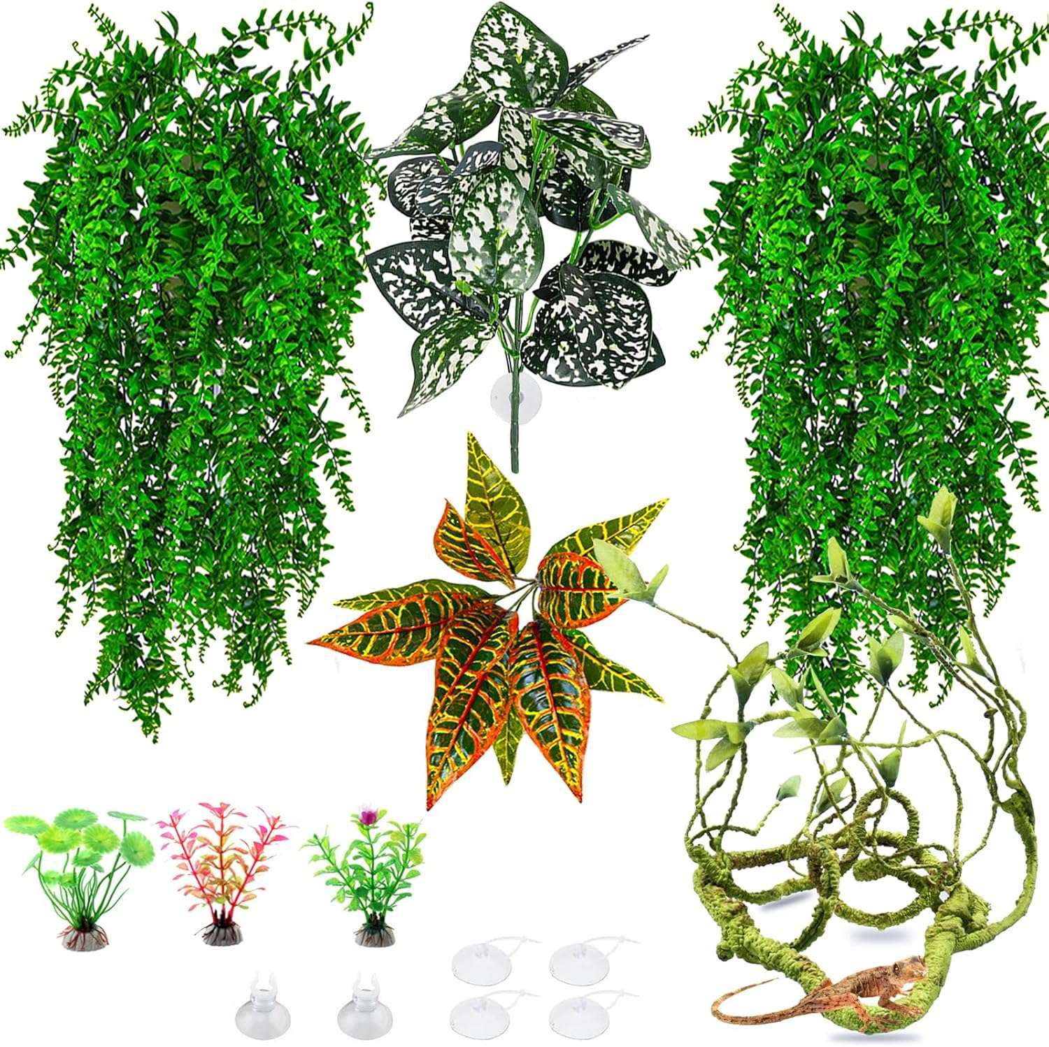El paquete incluye: 2 plantas colgantes, 2 plantas cortas, 3 plantas de soporte, ventosas. Perfecto para decoraciones de hábitat de reptiles, colgar terrarios, decoraciones de terrario de serpiente.