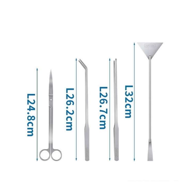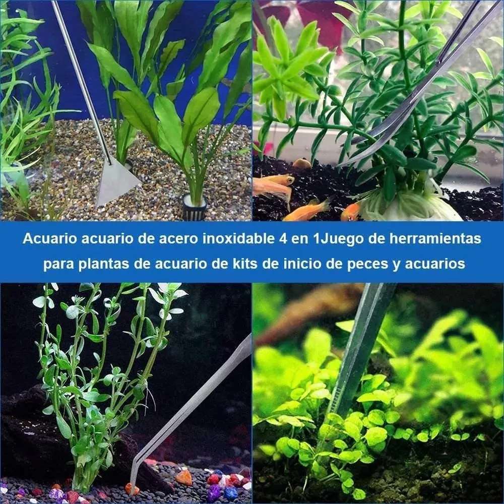 Herramientas Multifuncionales para Plantas El set incluye cuatro piezas fundamentales para tu acuario. Viene con pinzas rectas, pinzas curvas, tijeras curvas y una espatula. Son las herramientas ideales para recortar hojas marchitas, retirar elementos en descomposicion o plantar nuevos brotes, asegurando un entorno limpio y totalmente saludable.