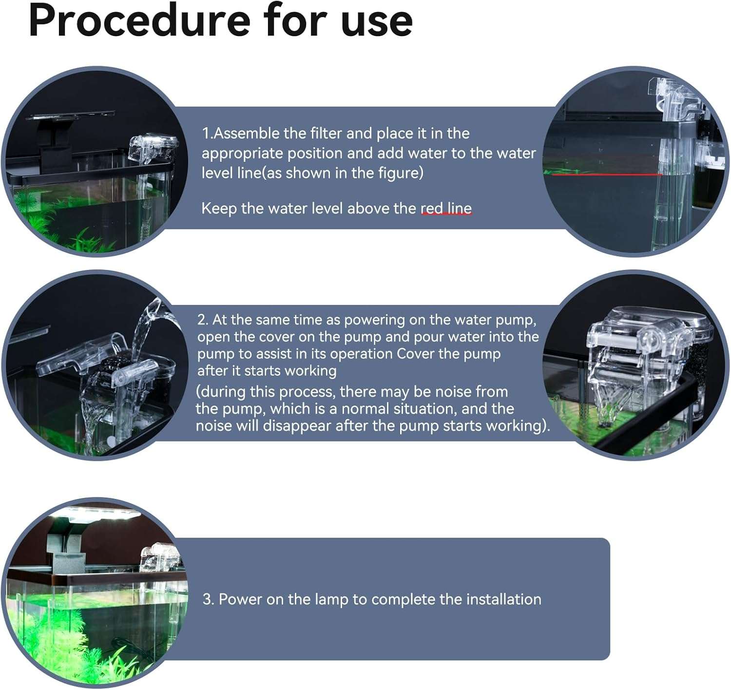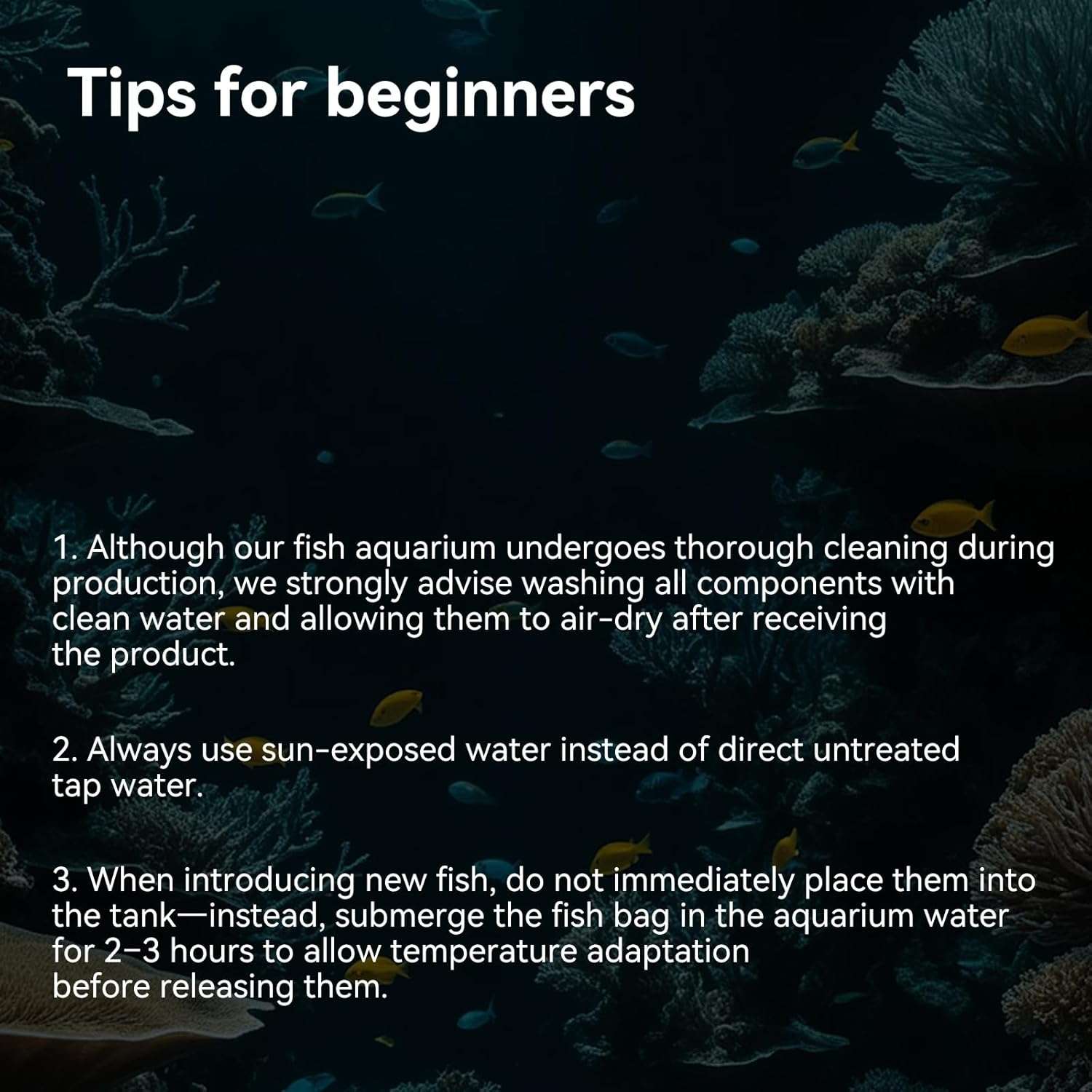 Guía completa para el nuevo propietario : Aunque nuestro acuario de peces se somete a una limpieza a fondo durante la producción, recomendamos encarecidamente lavar todos los componentes con agua limpia y dejarlos secar al aire después de recibir el producto. Siempre use agua expuesta al sol en lugar de agua del grifo sin tratar directamente. Al introducir peces nuevos, no los coloque inmediatamente en el tanque; en su lugar, sumerja la bolsa de peces en el agua del acuario durante 2-3 horas para permitir la adaptación de la temperatura antes de liberar a los peces. Deseamos a sus mascotas acuáticas un crecimiento robusto y vitalidad