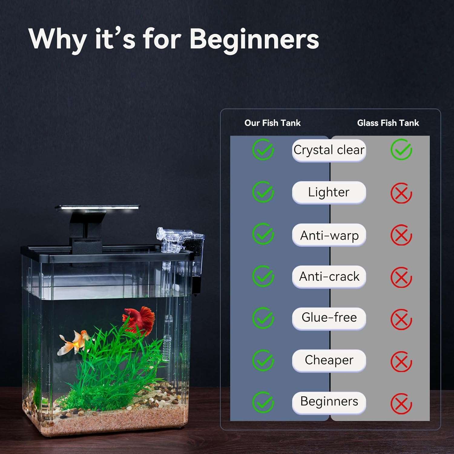 Perfecto para principiantes: deshazte de tanques de vidrio pesados, frágiles y caros. Hecho de plástico PET de alta calidad, este acuario ofrece una durabilidad ligera excepcional (sin deformación ni rotura) mientras combina una claridad similar al vidrio a un precio asequible. Este pequeño acuario está diseñado específicamente para especies de agua fría como peces betta, peces de colores y camarones. Este kit de inicio es perfecto para que los principiantes aprendan a pescar en la etapa temprana