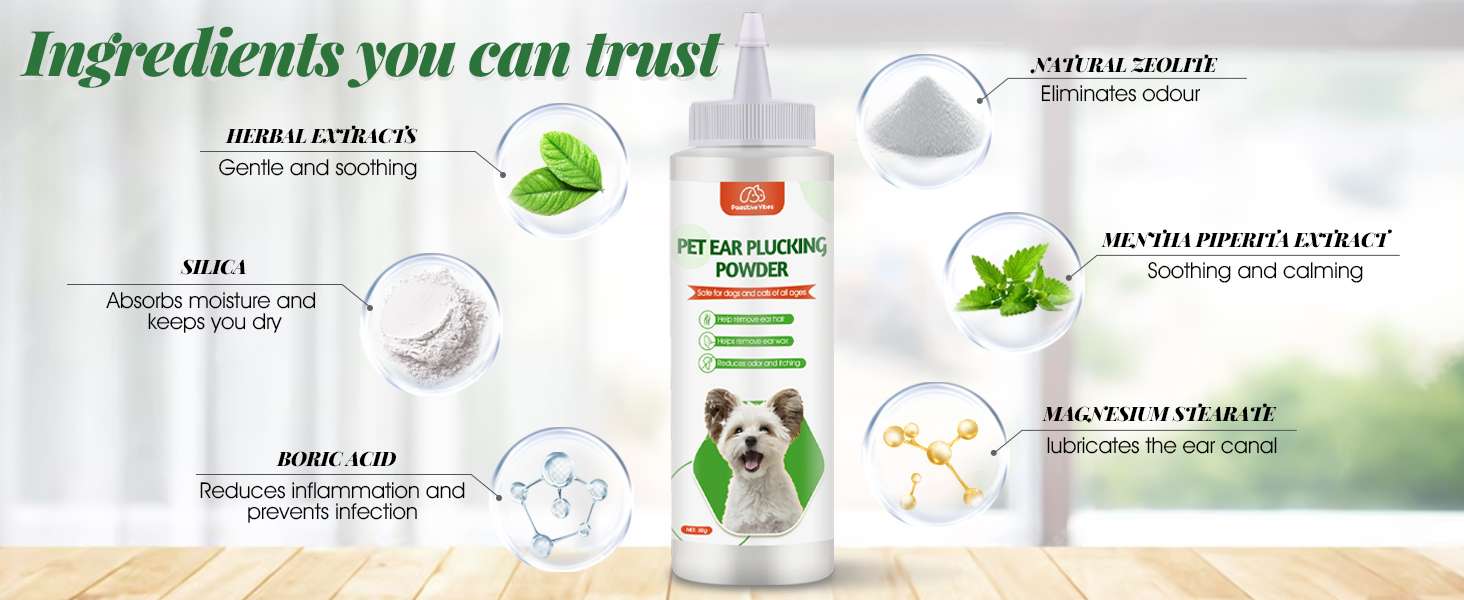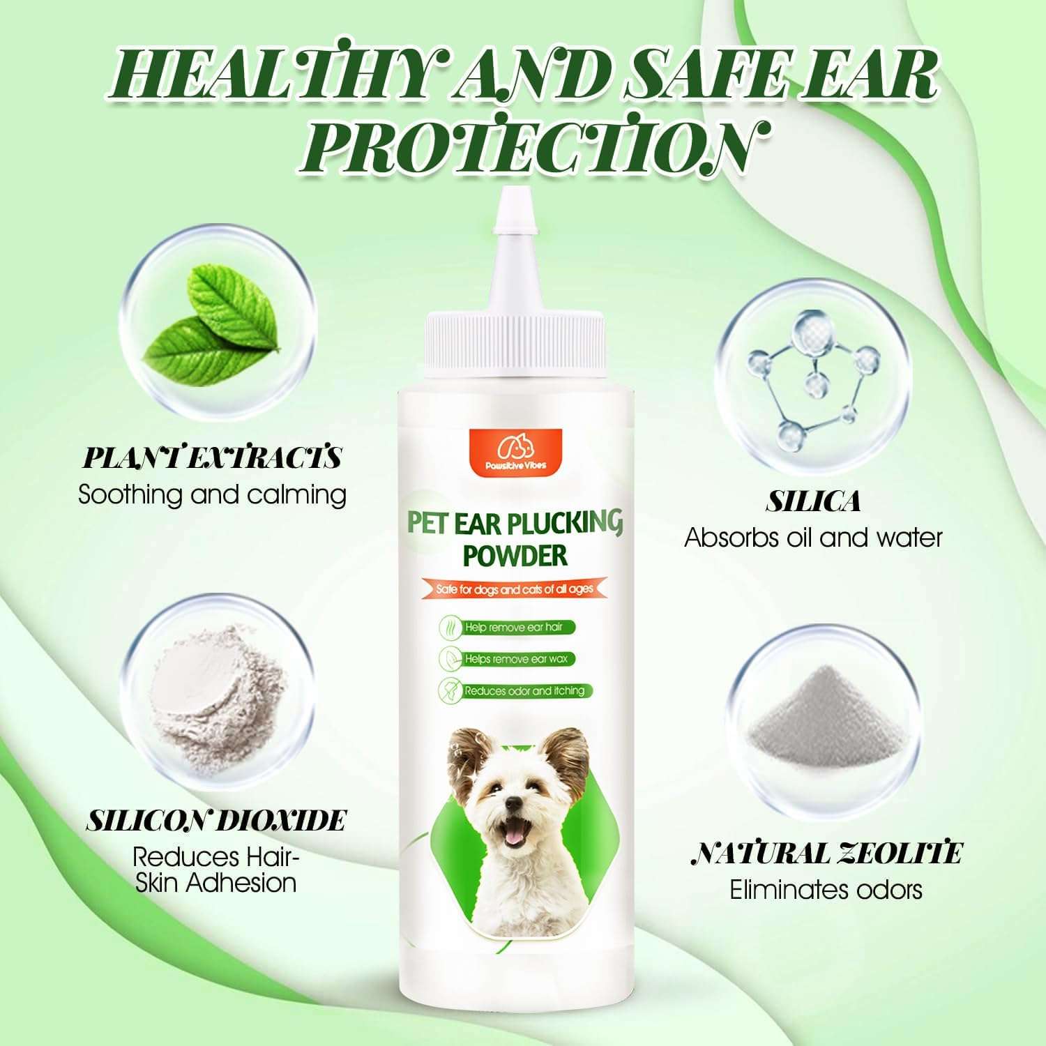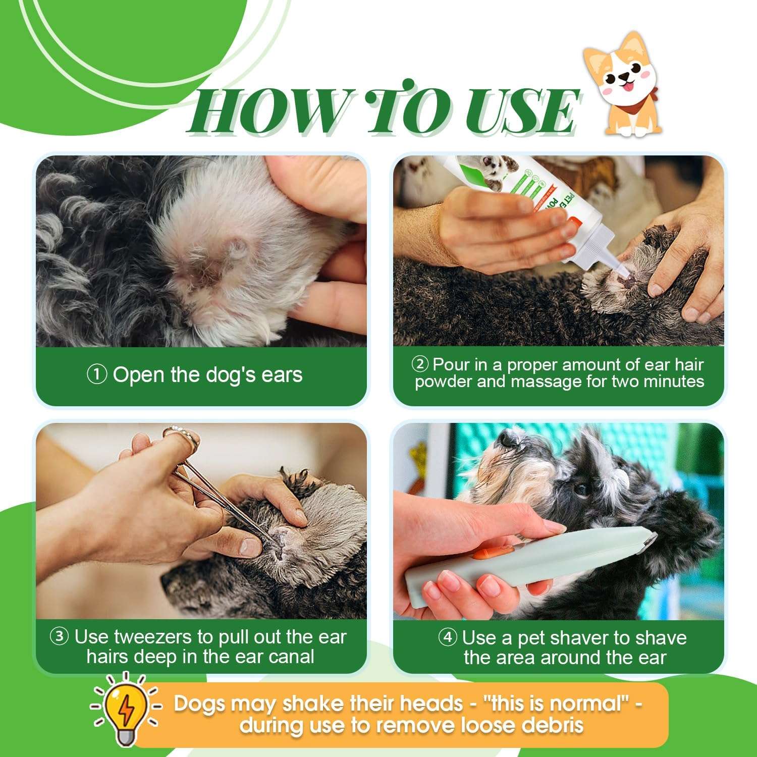 Polvo Secante y Calmante (Paso 1): Aplica este polvo especial dentro del oído antes de empezar. Su fórmula veterinaria seca la grasa del canal auditivo y crea fricción en el pelo, haciendo que el agarre sea firme y, lo más importante, reduce el dolor del tirón para que tu perro esté tranquilo.