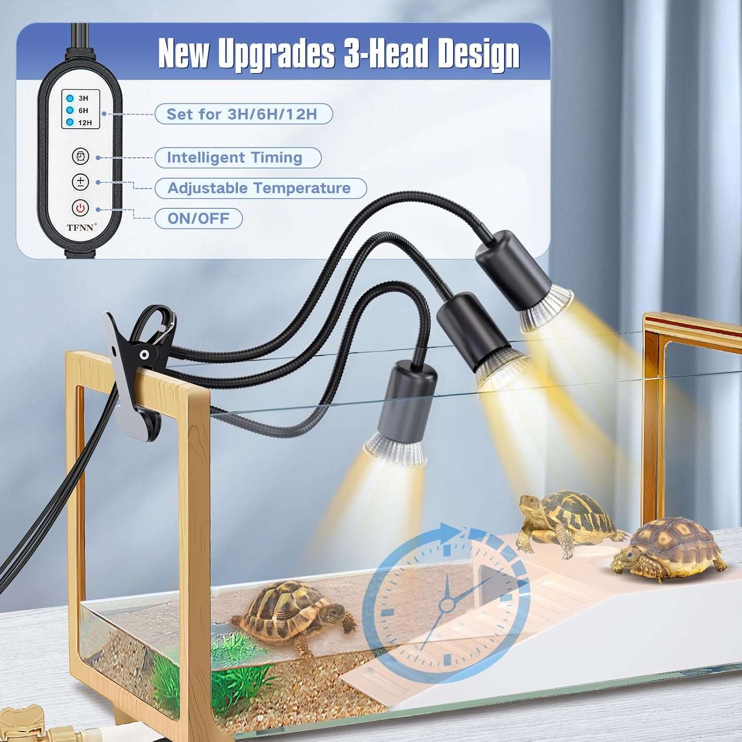Diseño de tres cabezales mejorado: esta lámpara de calefacción TFNN de tres cabezales tiene un rango de irradiación más amplio que el cabezal normal y doble cabezal, proporciona tres veces más calor y luz ultravioleta UVA/B, se puede calentar e iluminar por múltiples reptiles al mismo tiempo, se puede ajustar la luz, se puede aplicar a diferentes estaciones y diferentes temores de reptiles, se puede abrir por separado una de las luces o múltiples luces, se puede utilizar muy conveniente.