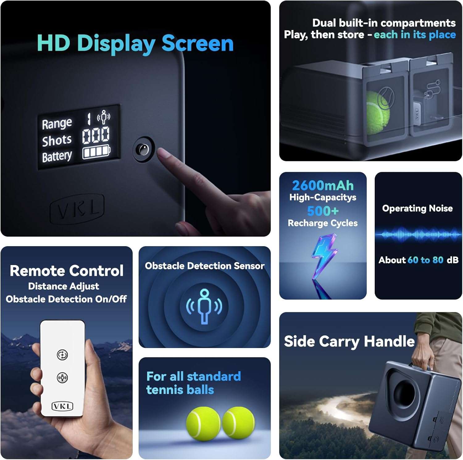 Su construcción es sumamente ligera pesando solo 1 kilo 800 gramos e incluye un mango lateral ergonómico que hace que las salidas al aire libre sean muy fáciles de llevar a cabo Funciona con una bateria de larga duración de 2600 miliamperios Además posee dos compartimentos de almacenamiento diseñados para guardar tres pelotas de tenis el control remoto y el cargador manteniendo todo perfectamente organizado para el juego