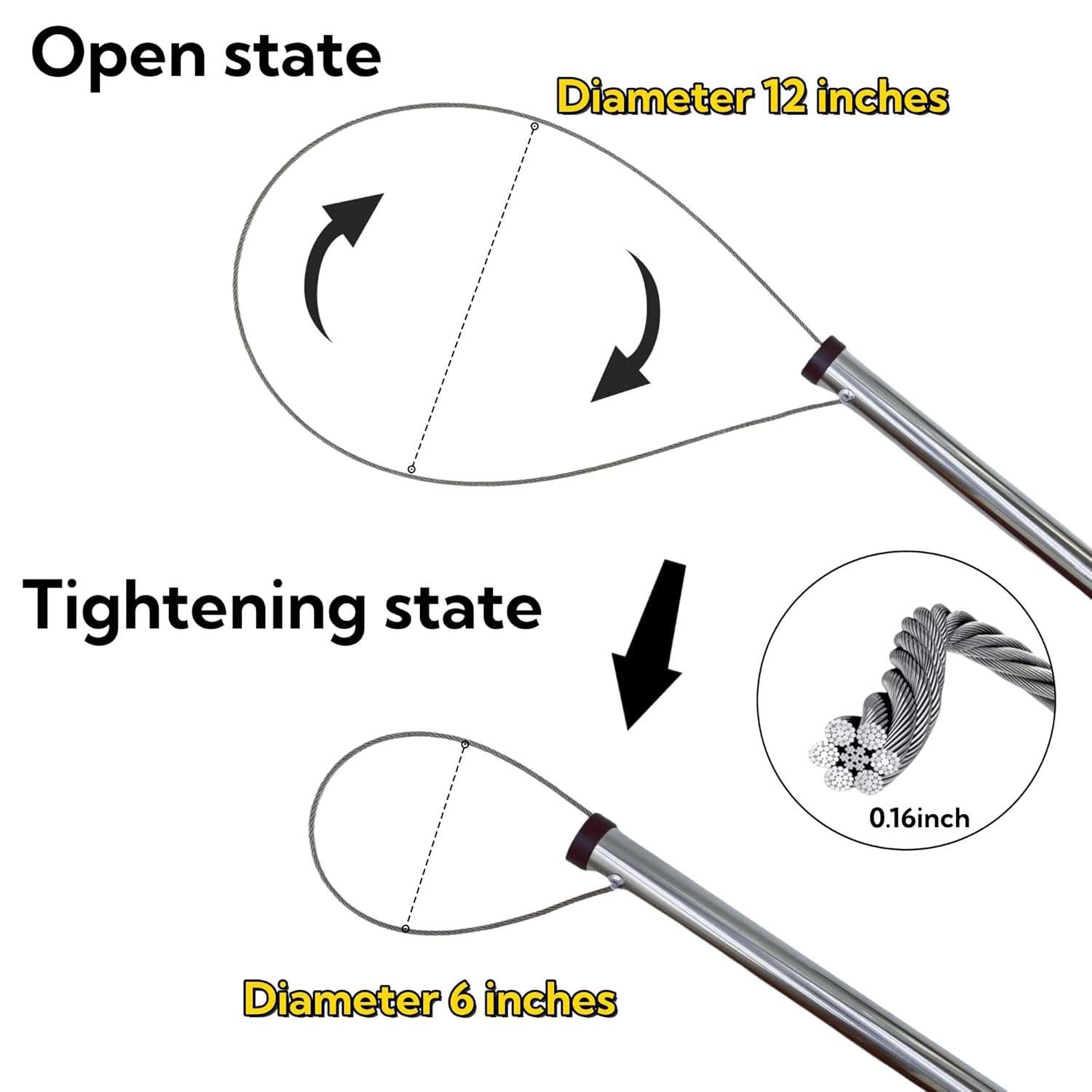 Mecanismo de Bloqueo y Liberacion Segura: Cuenta con un sistema de lazo con cable de acero recubierto que se ajusta y bloquea instantaneamente para asegurar al animal sin asfixiarlo. El mecanismo de liberacion rapida permite soltar al animal de manera segura y facil una vez que esta contenido.
