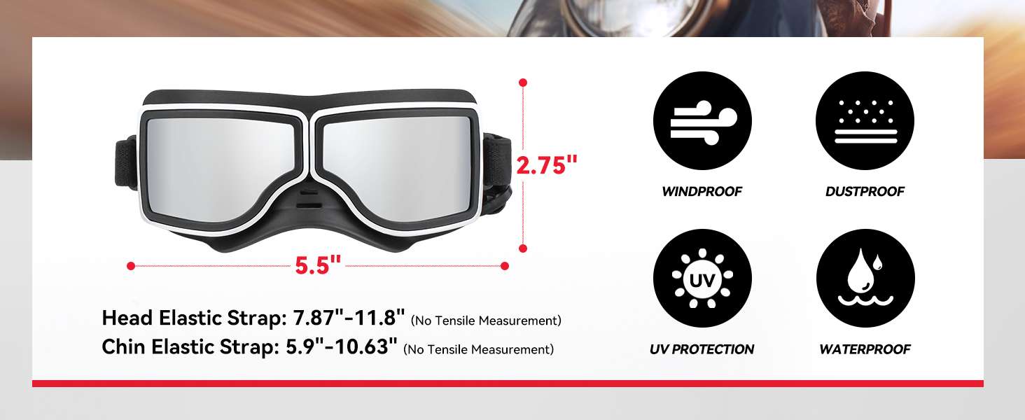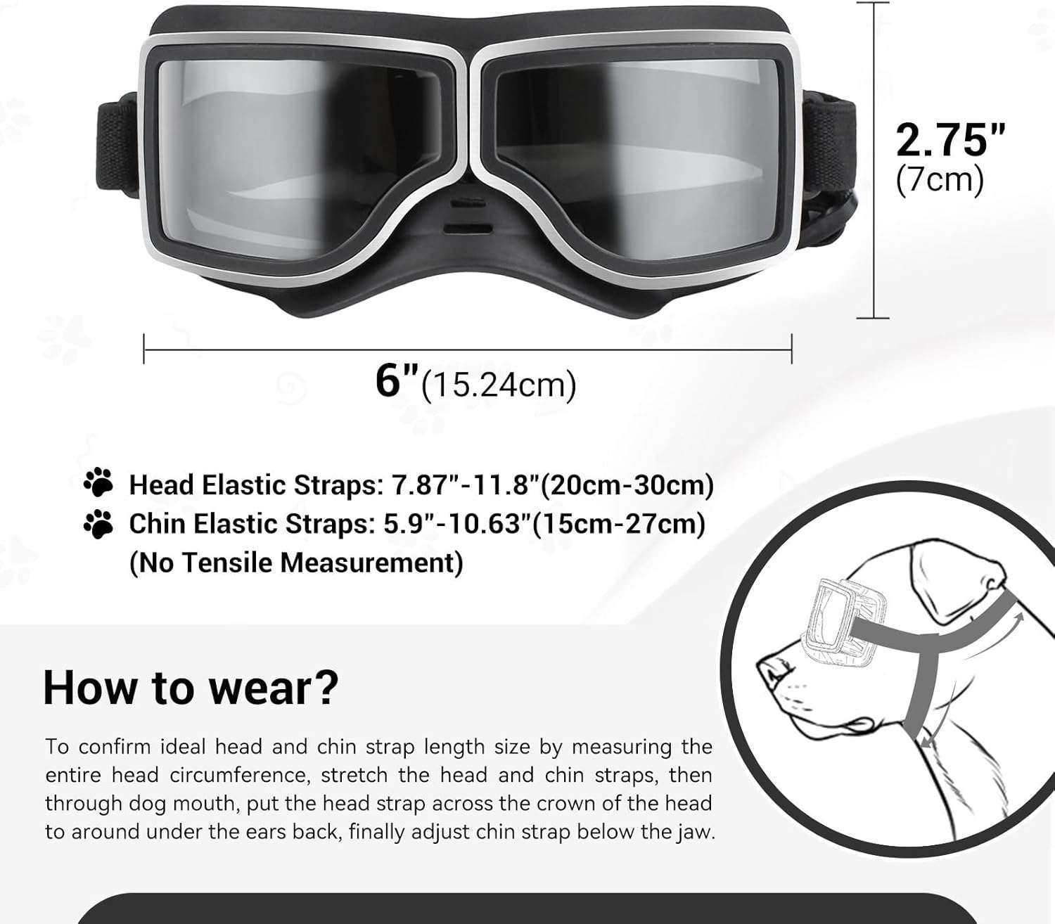 Especial para Razas Grandes y Medianas: Ajuste firme. Correa Cabeza: 20 a 30 cm. Correa Barbilla: 15 a 27 cm. Diseñadas para adaptarse a la estructura de Golden Retriever, Labrador, Pastor Aleman, Doberman y Gran Danes. Sus correas ajustables aseguran que los lentes no se caigan durante el movimiento.