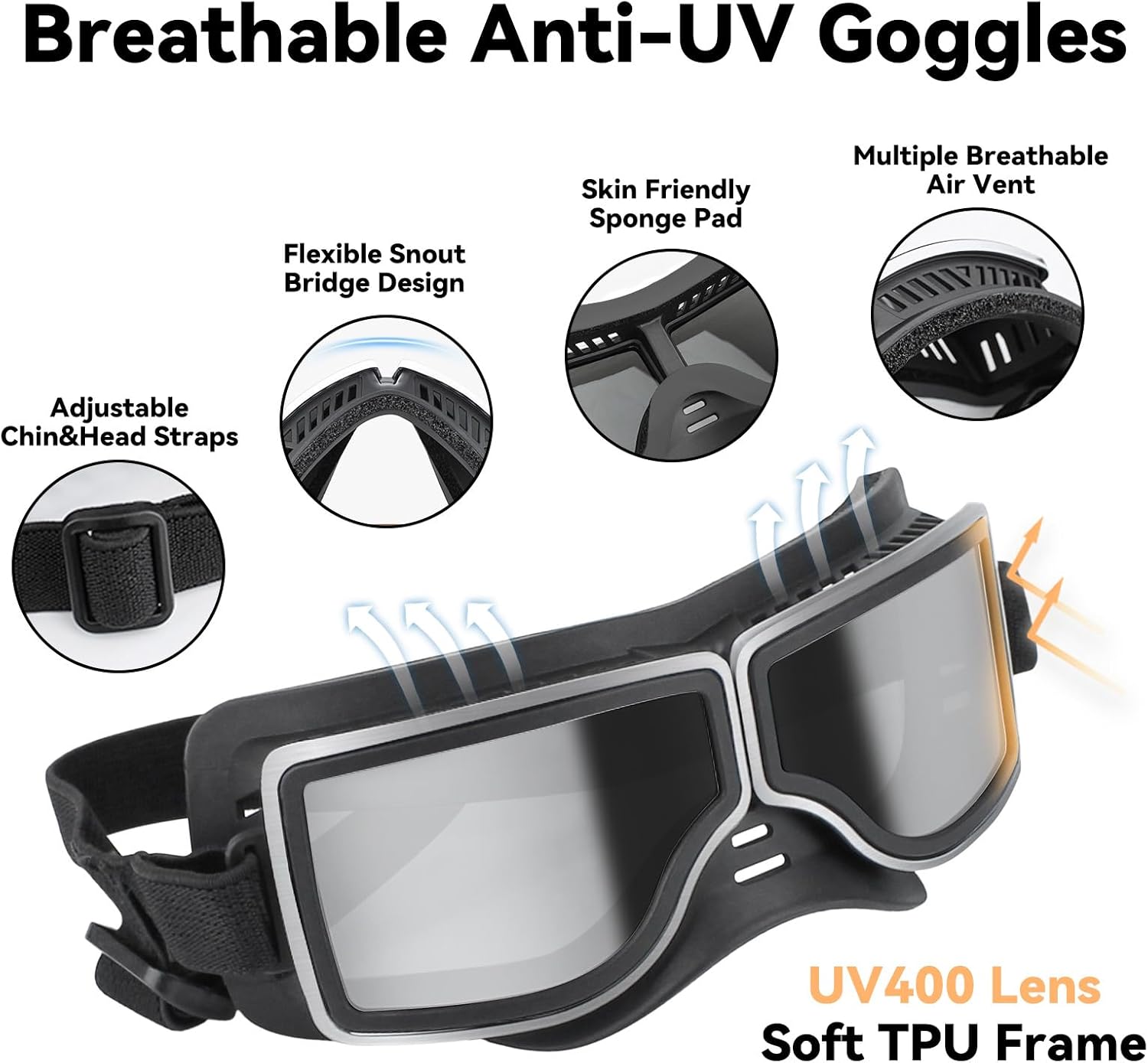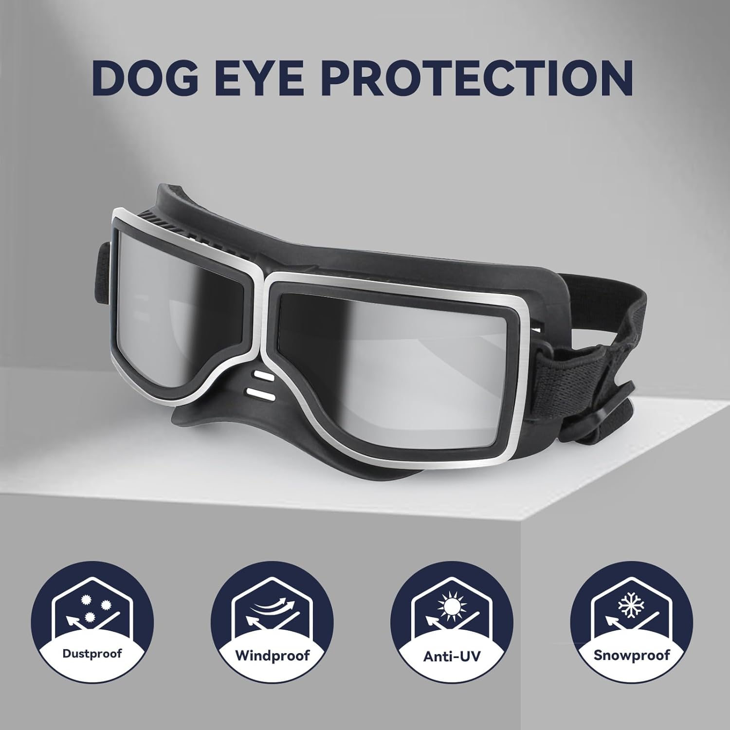 Proteccion Total UV y Clima: Seguridad diaria. Especializadas en ojos sensibles, bloquean eficazmente los rayos UV, el viento, la lluvia y la nieve. Son el accesorio esencial para evitar la resequedad ocular cuando el perro viaja con la cabeza fuera de la ventana del auto o en zonas ventosas.