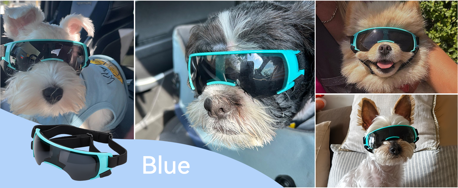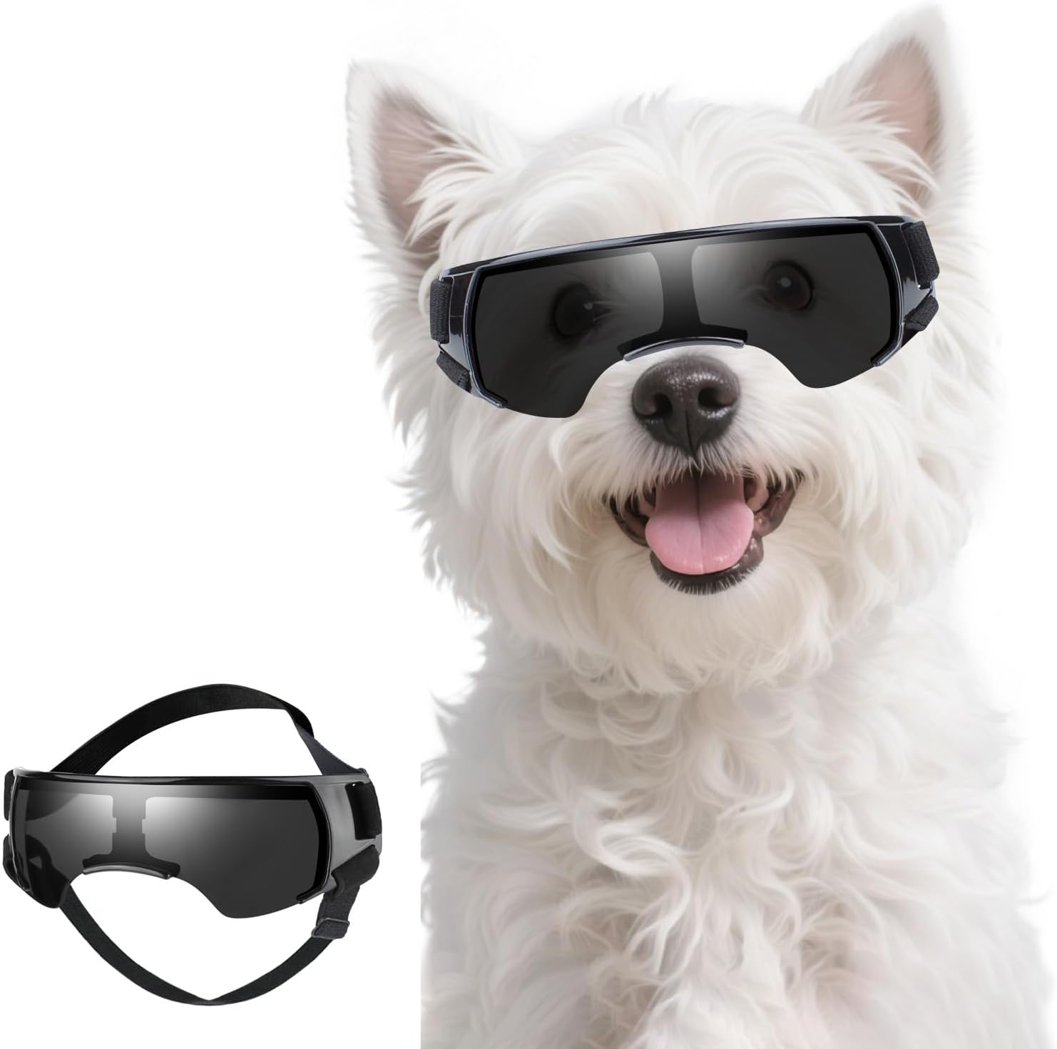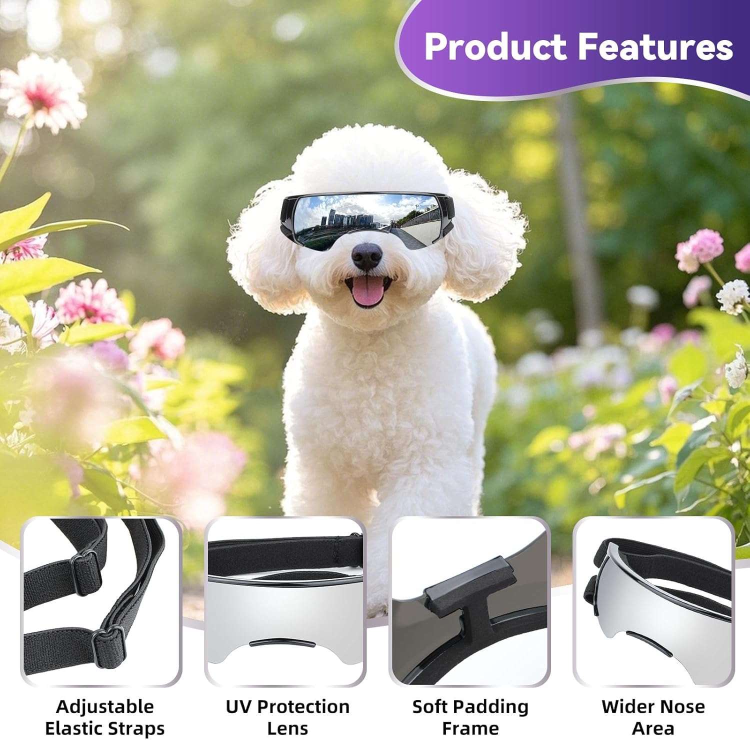 Estos lentes de sol PETLESO estan diseñados ergonomicamente para la comodidad de razas pequeñas. Con una lente curva continua y un acolchado interior suave, protegen los ojos sensibles del viento y el sol, siendo el accesorio indispensable para paseos en moto, bicicleta o caminatas largas.