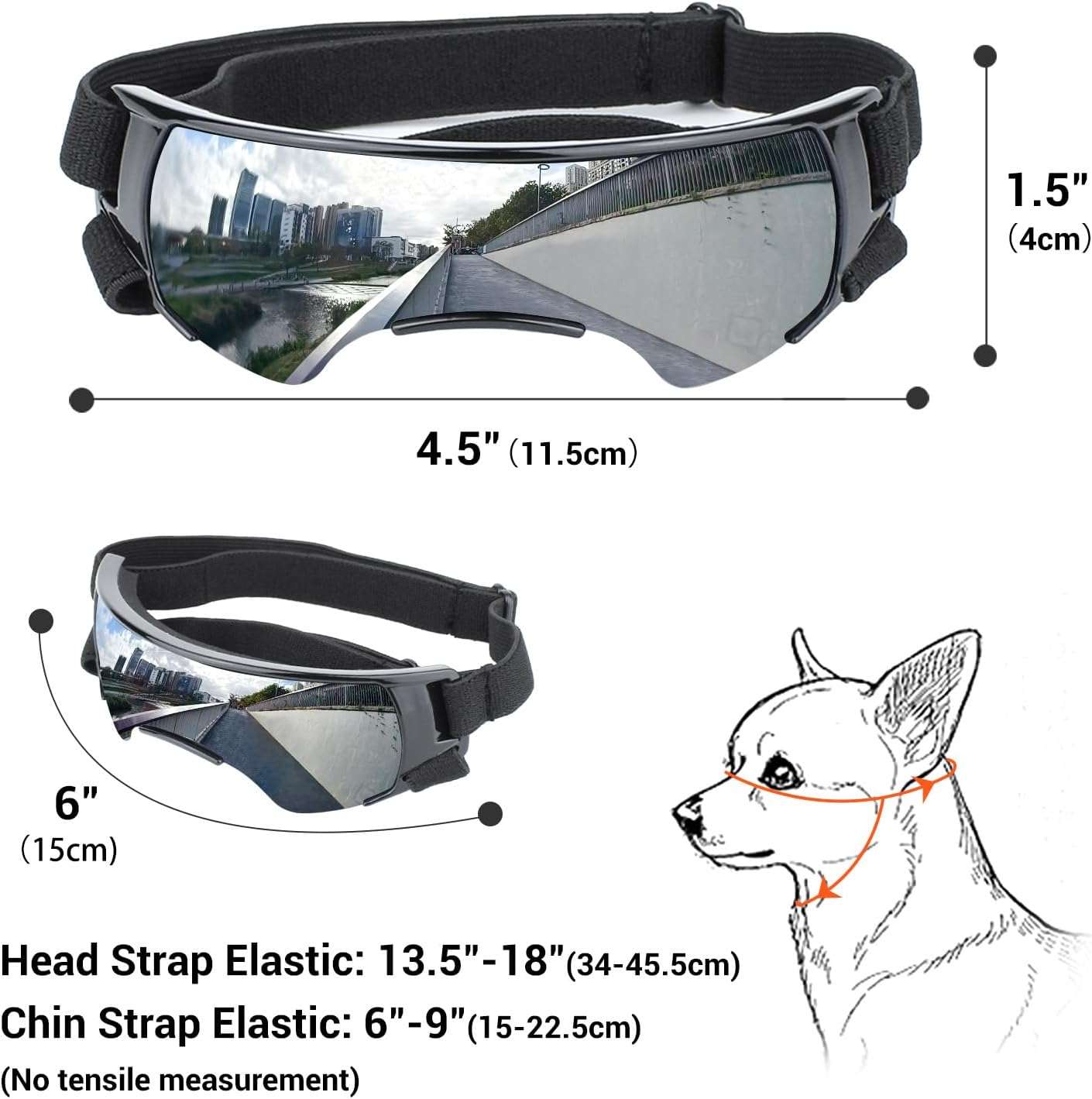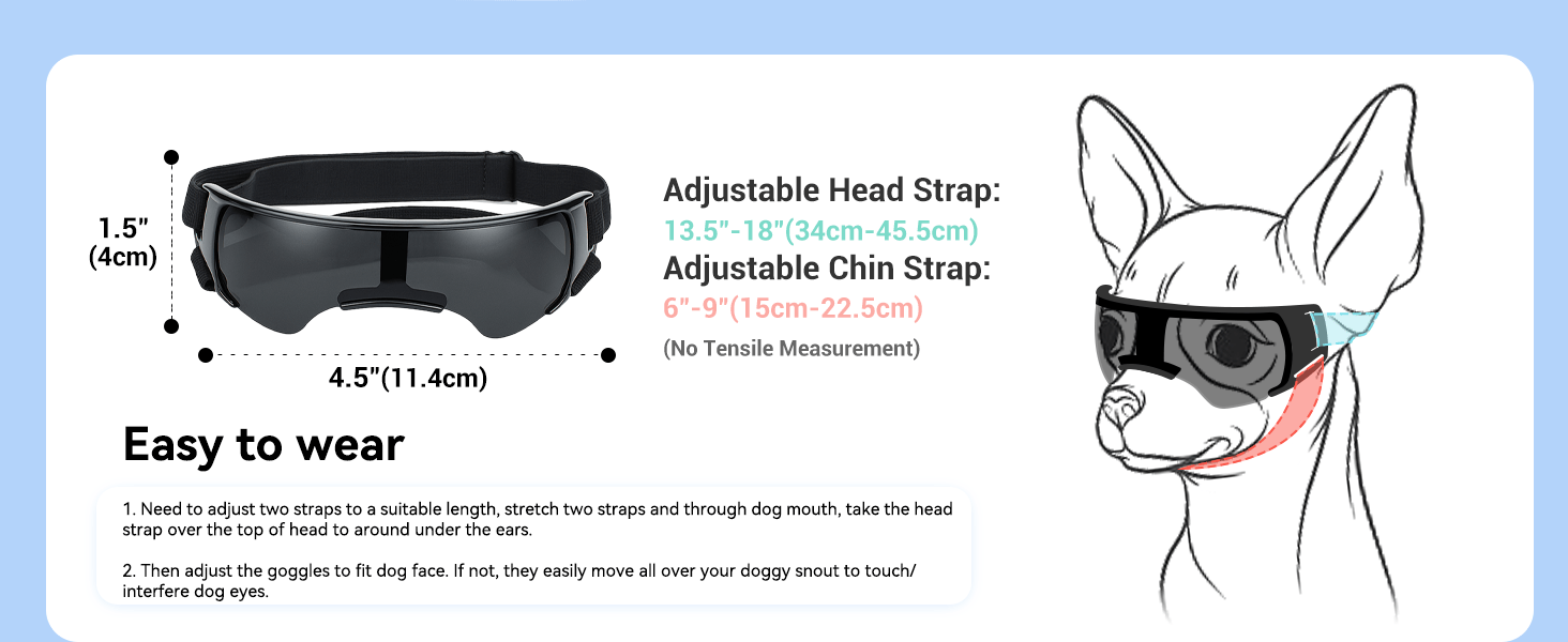Correas Ajustables para Cabeza y Barbilla: Ajuste seguro. Personalice el tamaño para que su perro se mueva con libertad. El sistema de doble correa elastica asegura que los lentes no se caigan durante el juego o el viaje. Nota: Diseñados para razas pequeñas estandar, no recomendados para perros “extra pequeños” o de taza de te.