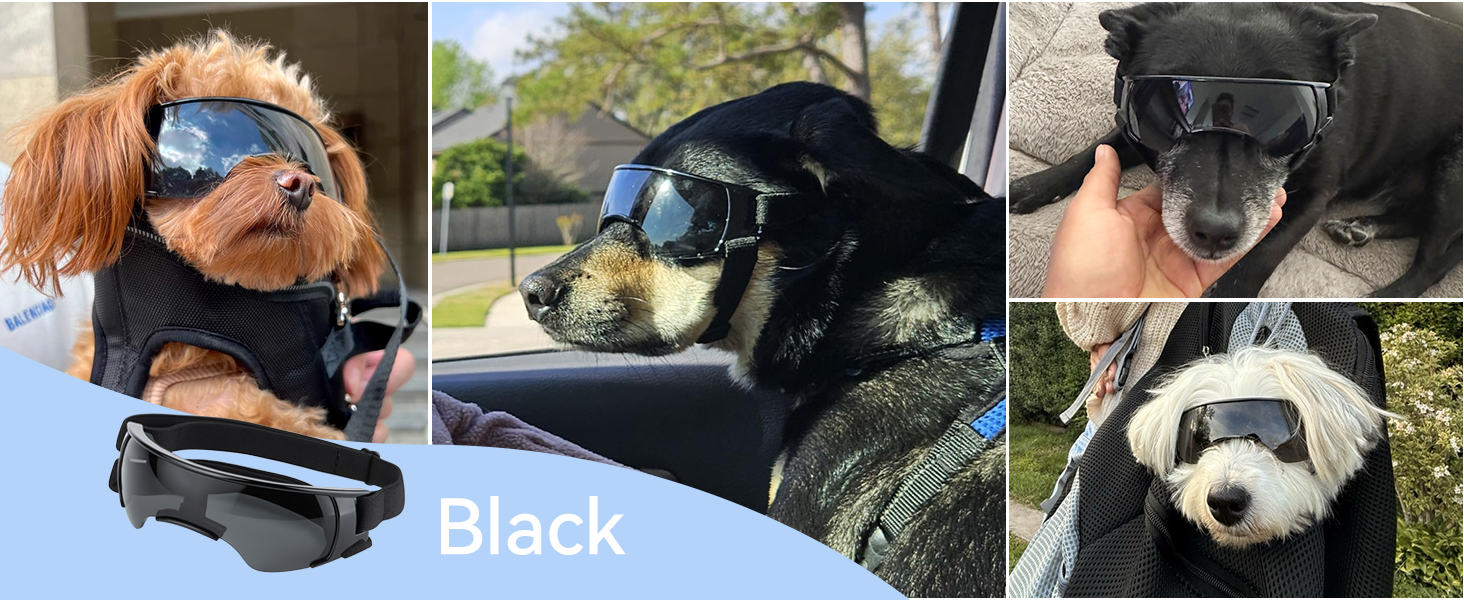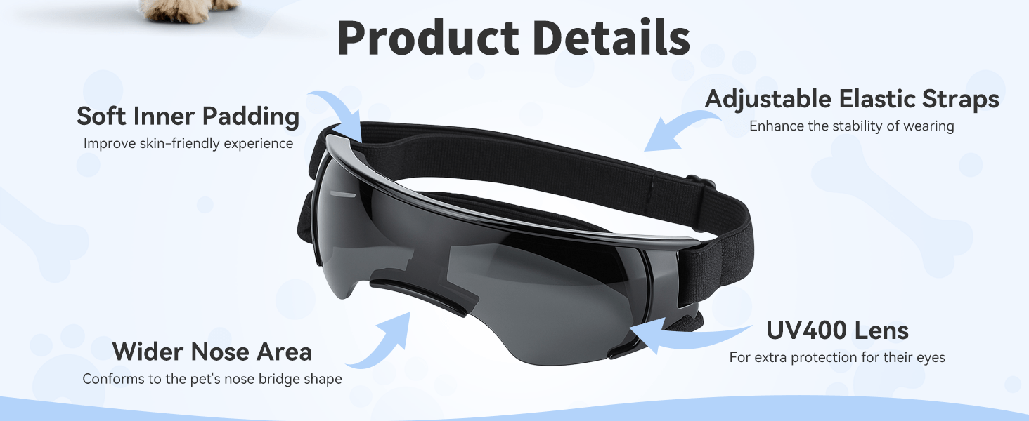 Lente Curva con Proteccion UV400: Cobertura total. La lente de una sola pieza ofrece un campo de vision amplio y cuenta con certificacion UV400 para bloquear los rayos solares dañinos. Ademas, actua como un escudo contra el polvo, insectos y viento fuerte, ideal para perros con ojos sensibles o problemas de vision.