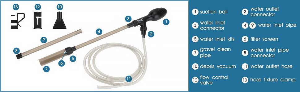 Amplia aplicación: limpiador de grava para acuario adecuado para tipos de mini tanques de peces pequeños medianos, con tubos de extensión empalmados, y se puede instalar de acuerdo a la demanda. Cuatro combinaciones básicas: mango+2 tubos + cabeza de pico de pato (29.5 pulgadas); mango+1 tubo + cabeza de pico de pato (19 pulgadas); mango+2 tubos + tubo de grava (32 pulgadas); mango + 1 mango tubo + grava tubo(22.4 in)