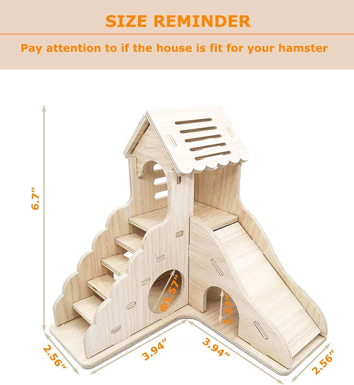 Escondite divertido: Este hábitat de hámster tiene varios espacios secretos, agujeros una pequeña escalera y un tobogán, proporcionan un área de juegos para que el ratón se esconda, almacene comida, trepe y juegue, el espacio es propicio para dormir durante el día. Esta cabaña satisface su instinto de juego y ayuda a reducir su soledad y aburrimiento.