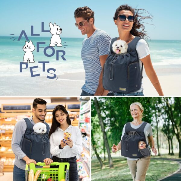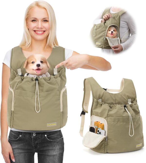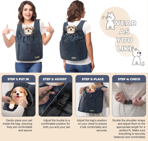 Amplio almacenamiento para artículos esenciales: el transportador frontal para perros pequeños ofrece un amplio almacenamiento, incluyendo un bolsillo frontal ampliado para un iPad, un bolsillo lateral derecho para golosinas y pañuelos de mascotas, y un bolsillo trasero oculto con cremallera para objetos de valor como teléfonos e identificaciones. Mantiene todos tus elementos esenciales fácilmente accesibles durante el viaje.