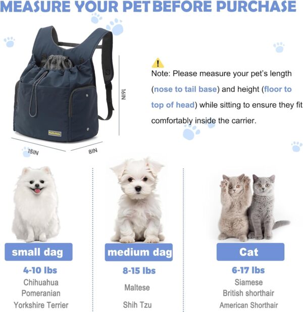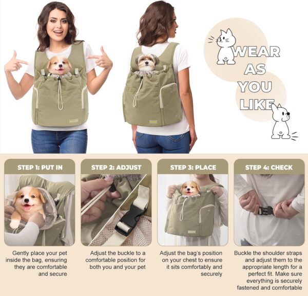 Tamaño ideal para tu mascota: el transportador frontal para perros mide 15 pulgadas de largo x 8 pulgadas de ancho x 16 pulgadas de alto, soporta mascotas de hasta 13 libras. Es ideal para perros pequeños y medianos, gatos, cachorros y gatitos. Asegúrate de un ajuste adecuado midiendo la longitud de tu mascota (cuello a cola) y la altura (de piso a hombro) antes de comprar, proporcionando un amplio espacio para que tu mascota se relaje.