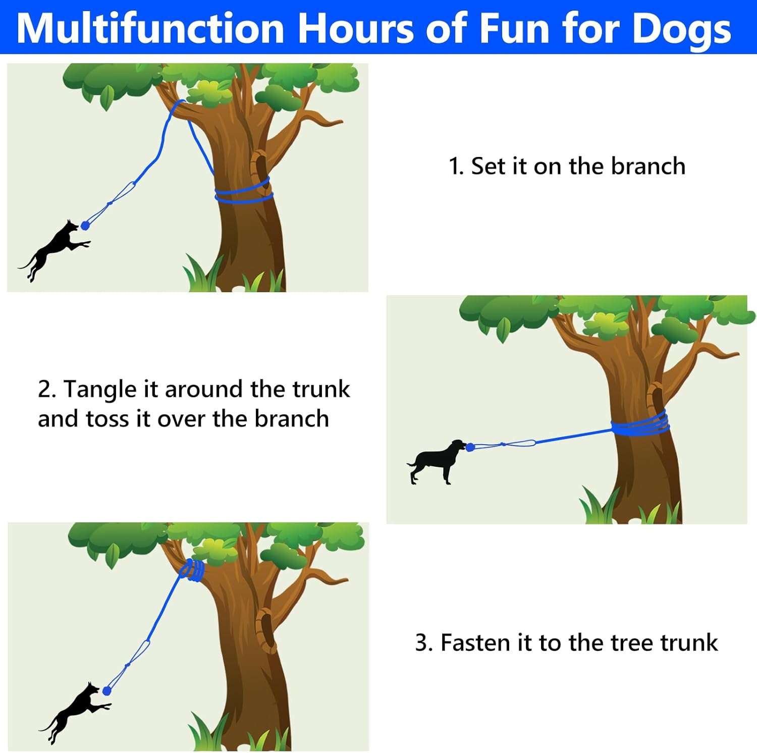 El producto incluye correas protectoras mas anchas para los arboles asegurando que no se dañe la corteza durante su uso Su diseño elastico permite que los perros salten tiren y se balanceen desarrollando su masa muscular y manteniendolos ocupados por horas lo cual es fundamental para reducir la ansiedad y evitar el comportamiento destructivo en el hogar