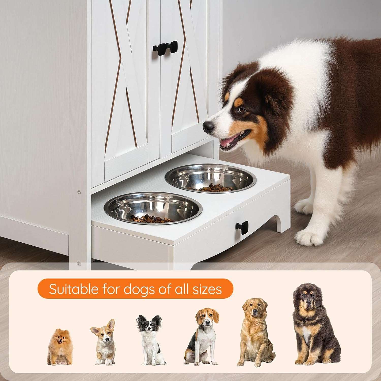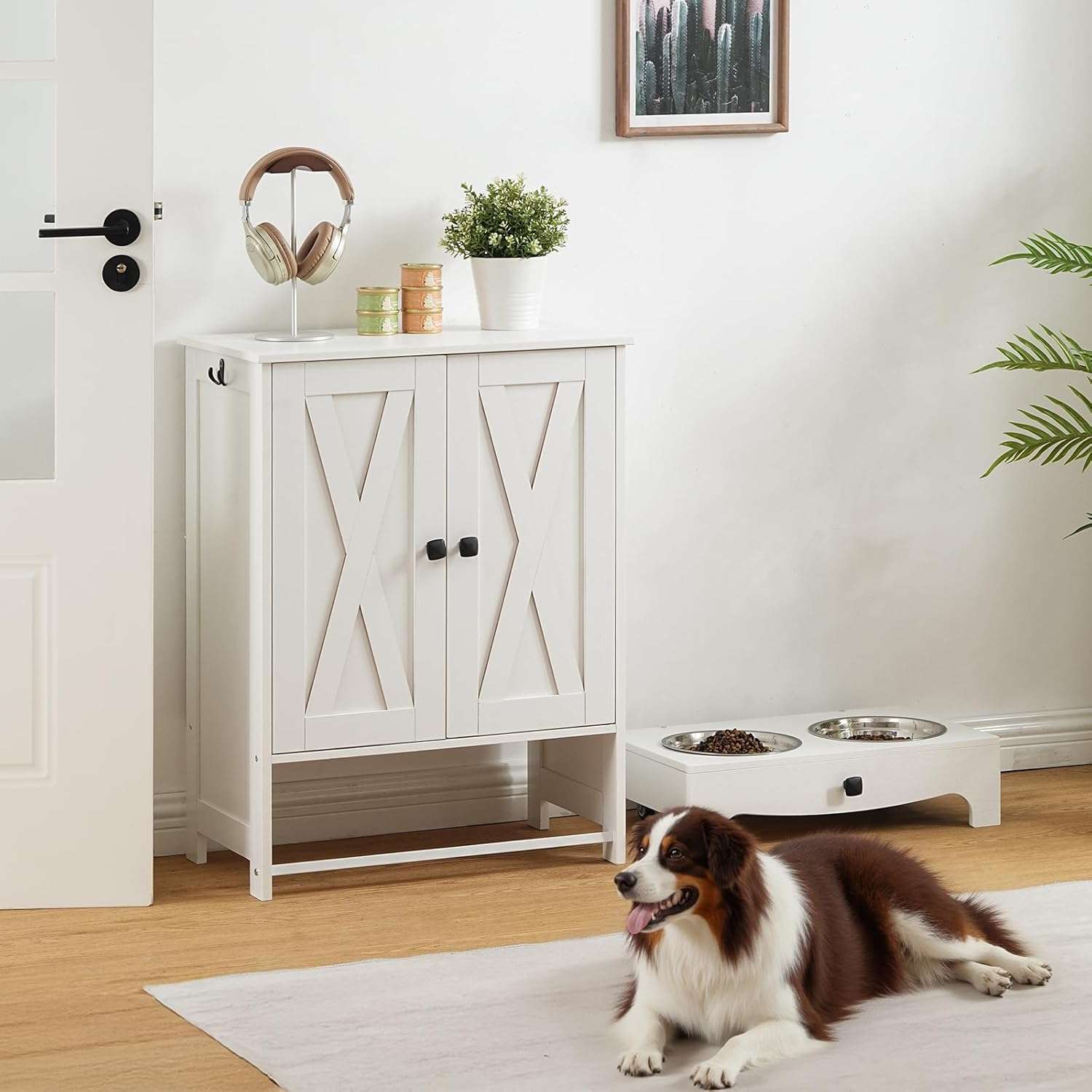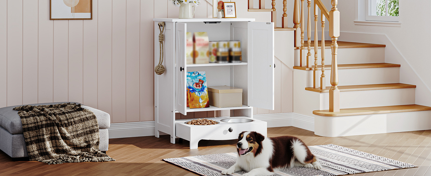 Mueble organizador con almacenamiento oculto Este mueble para mascotas es la solución ideal para mantener el orden en su hogar. Cuenta con un gabinete interno que incluye una repisa ajustable en tres niveles de altura, perfecta para guardar sacos de alimento, tarros de premios y juguetes. Es el diseño definitivo para decir adiós al desorden de los suministros de su perro, integrándolos de forma elegante en su cocina o logia.