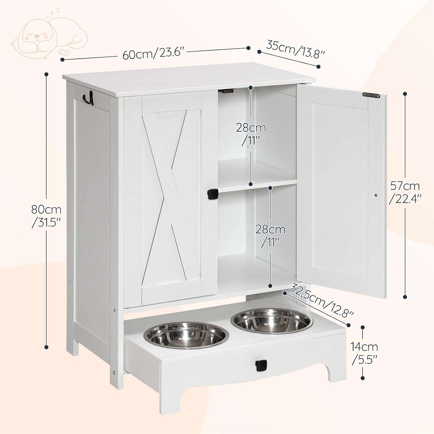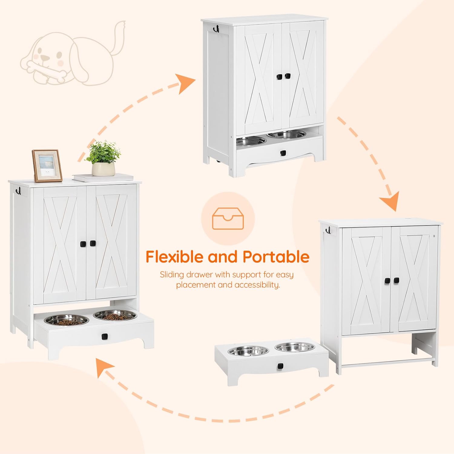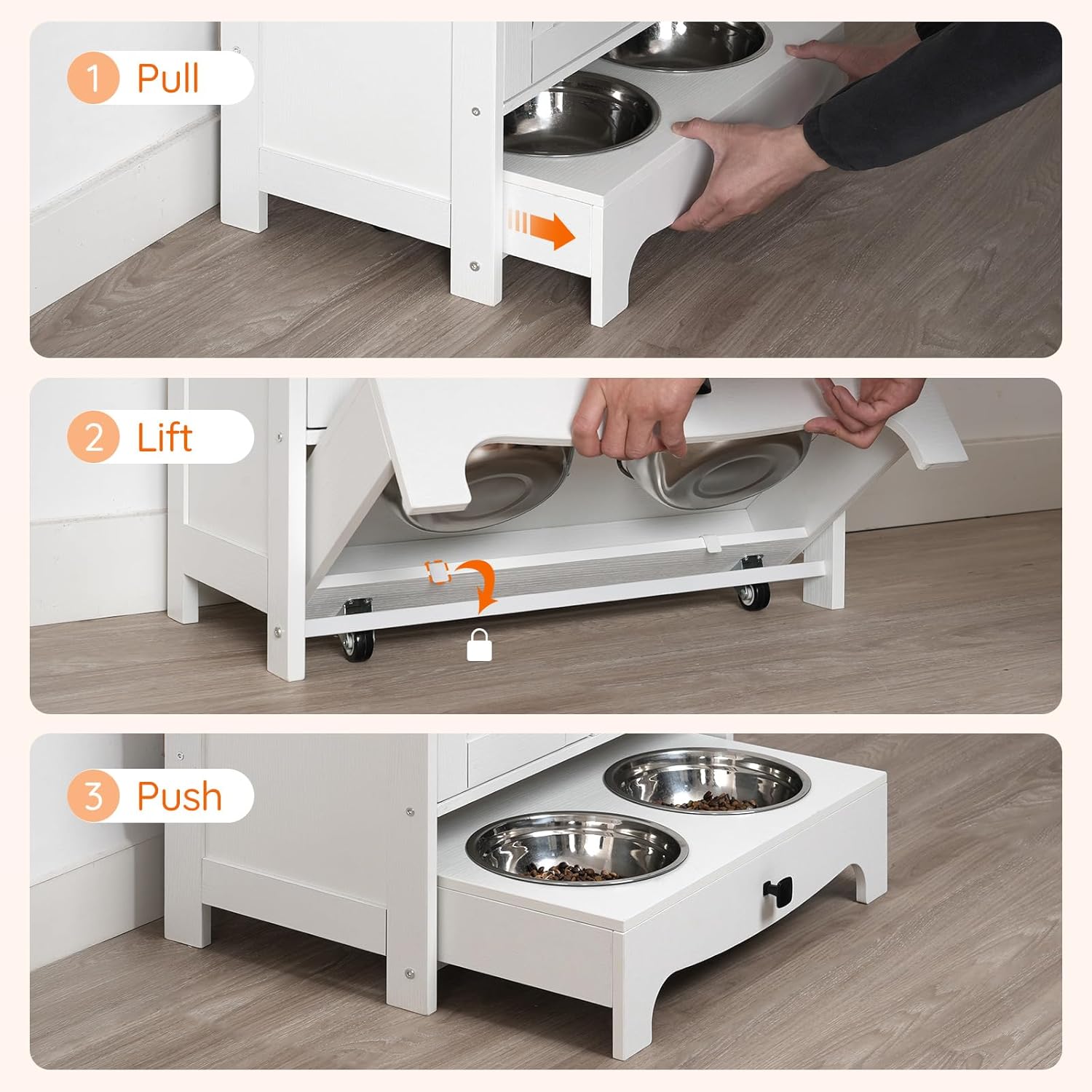 Estación de alimentación con cajón deslizable El mueble incorpora un cajón inferior que se desliza suavemente para revelar dos platos grandes de acero inoxidable de 22 cm de diámetro. Este sistema permite que su mascota coma cómodamente y, una vez termine, usted puede cerrar el cajón para ocultar los platos, ganando espacio y manteniendo el piso despejado y limpio.