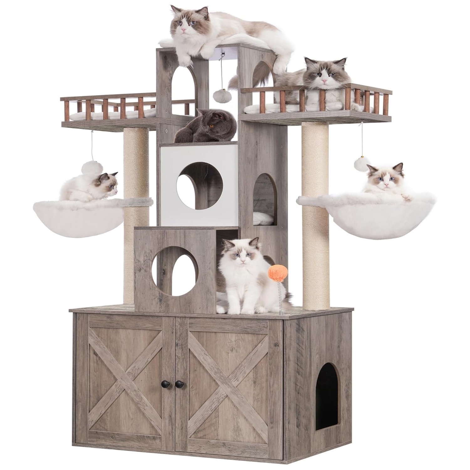 [3 perchas y 2 cuevas] Este árbol para gatos cuenta con 3 lujosas perchas superiores y con cercas alrededor de ellas que pueden proteger a tu bebé peludo cuando está durmiendo. Si tus gatos prefieren un lugar acogedor y privado, el condominio para gatos en el medio es una buena opción, 2 espaciosas cuevas para gatos, proporcionando múltiples lugares cómodos para que los gatos se relajen y observen, perfecto para hogares con varios gatos