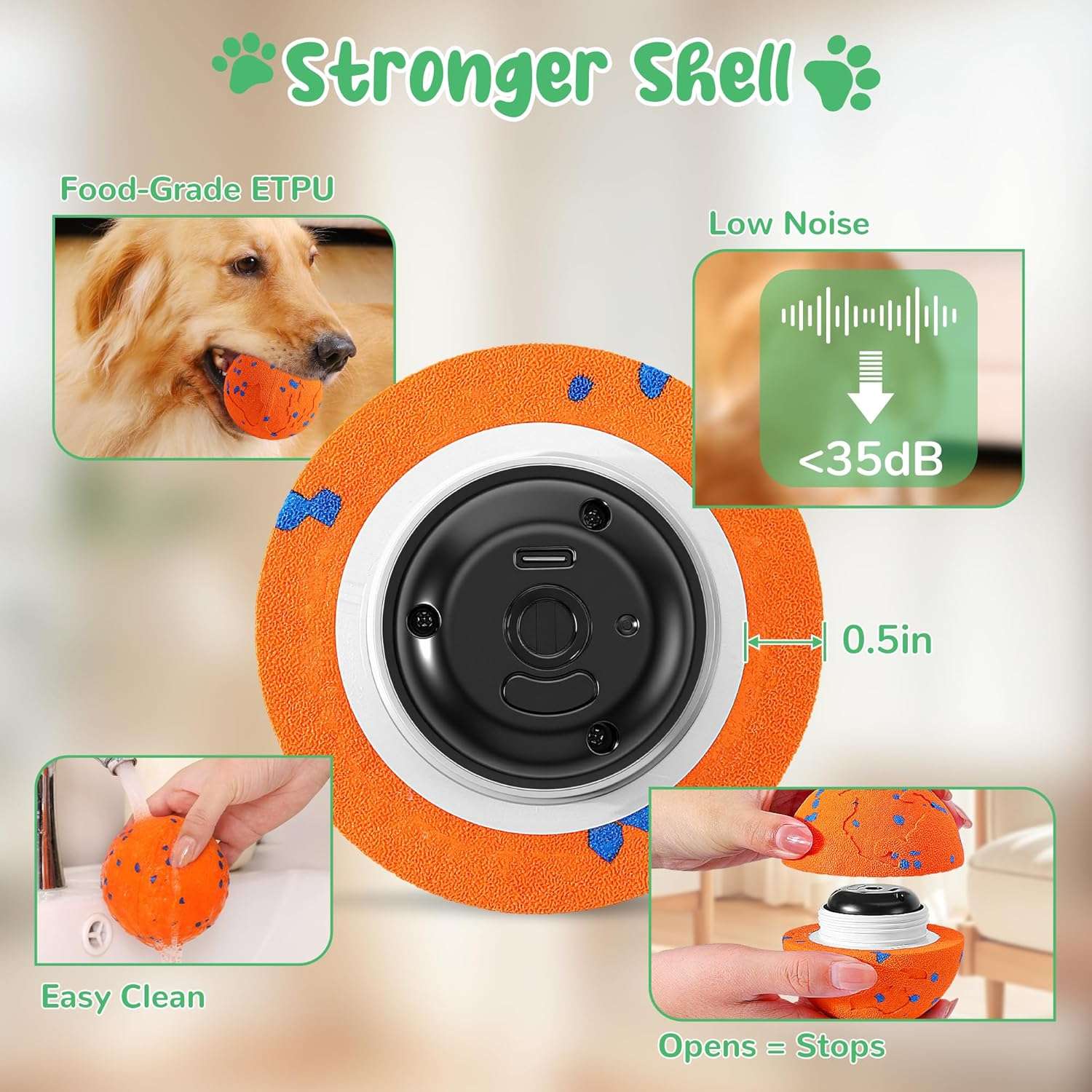 El dispositivo cuenta con tres modos inteligentes de funcionamiento suave normal y loco que se adaptan perfectamente al nivel de energia y estado de animo de su animal Fabricada con una gruesa capa ecologica mejorada de material e tpu esta pelota posee ranuras profundas de un centimetro y medio en forma de engranaje que evitan que los perros la abran al masticar ofreciendo una carcasa duradera resistente y a la vez muy suave para el cuidado de sus dientes