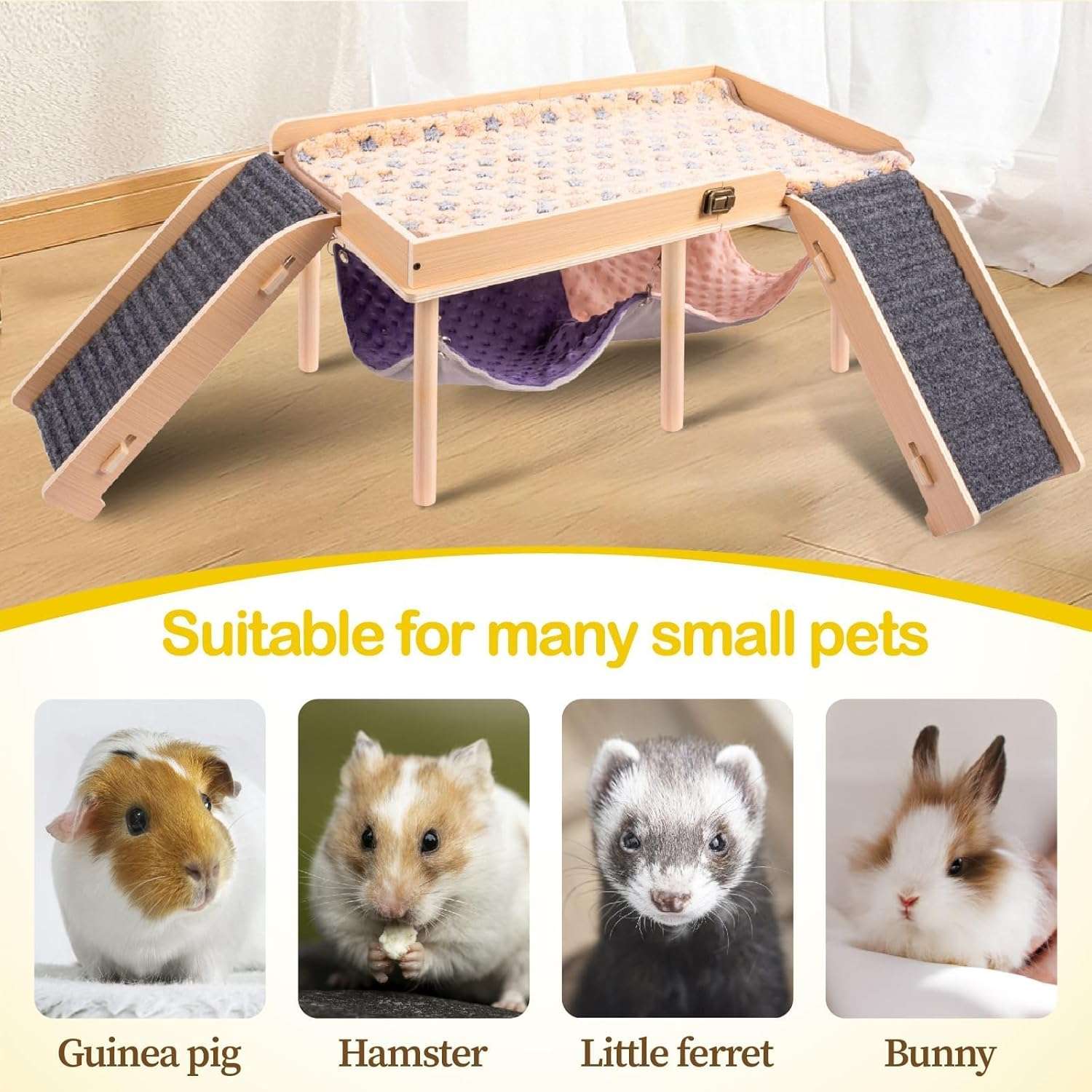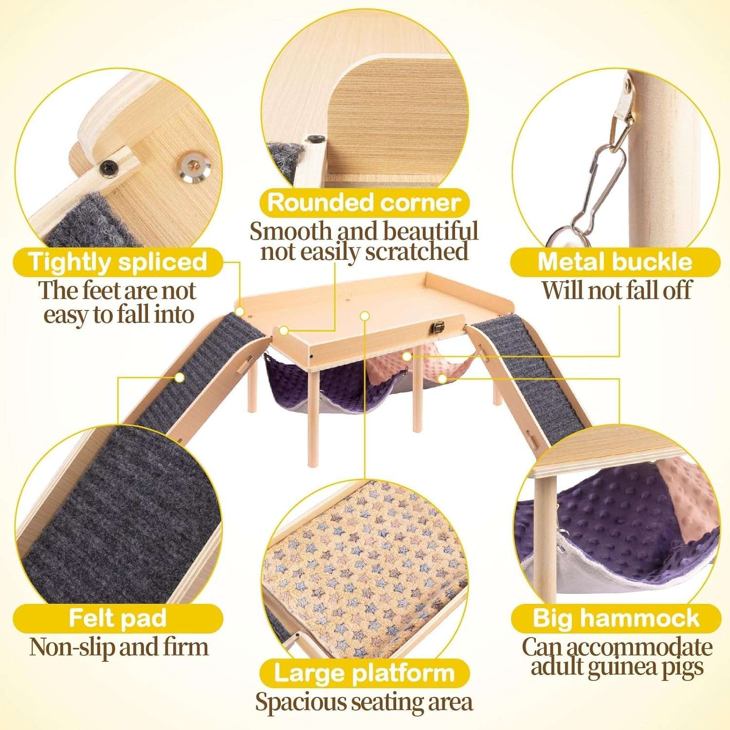 Tamaño grande Plataforma: 23.62 x 12.99 pulgadas, hamaca: 21.65 x 11.81 pulgadas, escaleras: 13.78 x 6.30 pulgadas. Esta hamaca y plataforma de conejillo de indias está diseñada para ser grande y adecuada para conejillos de indias de todas las edades. Hay una barandilla sobre la plataforma para proteger a los conejillos de indias. Las 2 escaleras son lo suficientemente anchas con almohadillas de fieltro para que los conejillos de indias suban y bajen fácilmente. Este diseño puede ayudar a los conejillos de indias a hacer ejercicio y jugar bien.