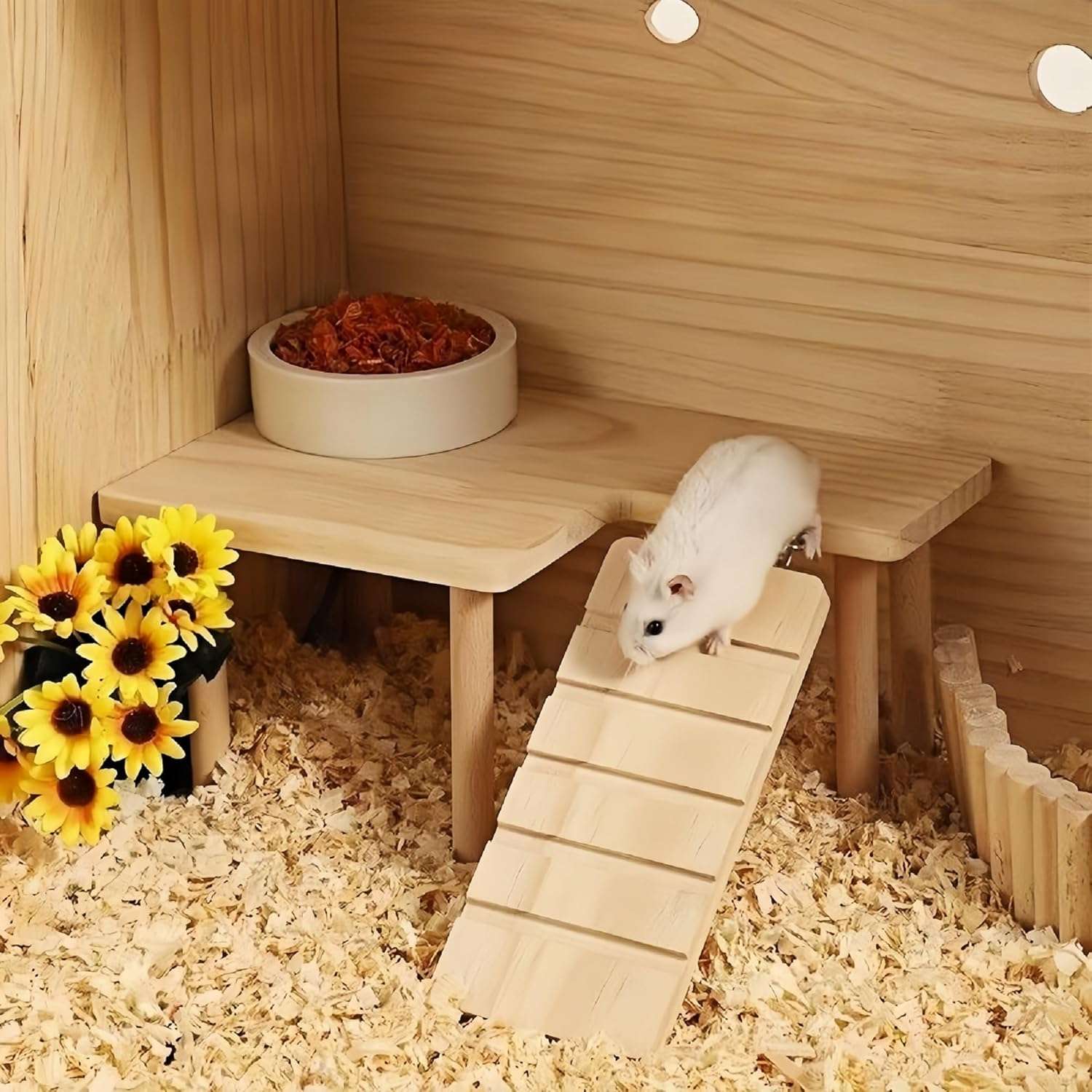 Material de madera de alta calidad: la plataforma para hámster está hecha de madera natural sin tratar, lo que garantiza su respeto al medio ambiente y no toxicidad. Está diseñado para ser seguro para morder, priorizando la salud y seguridad de los hámsters.