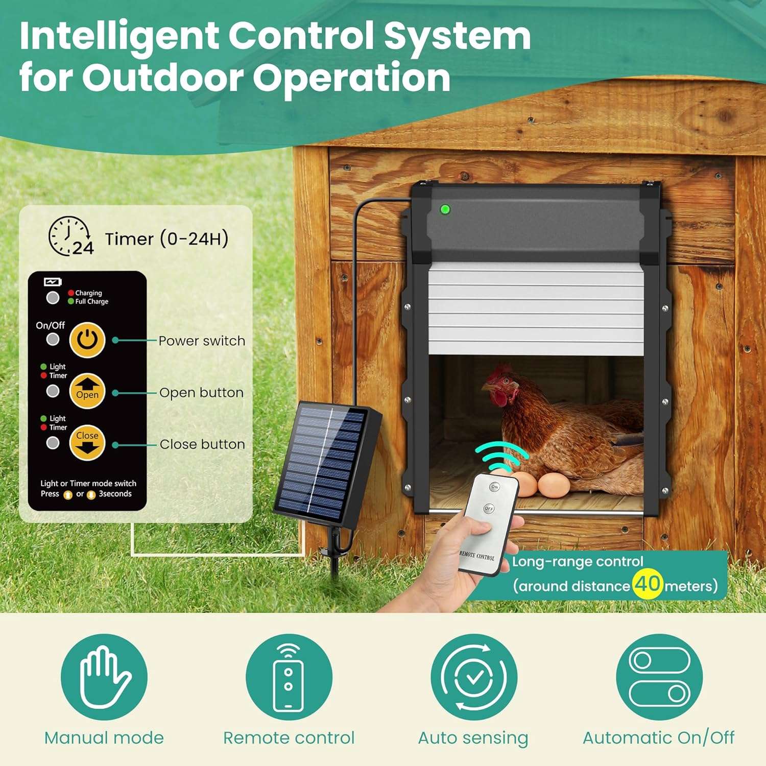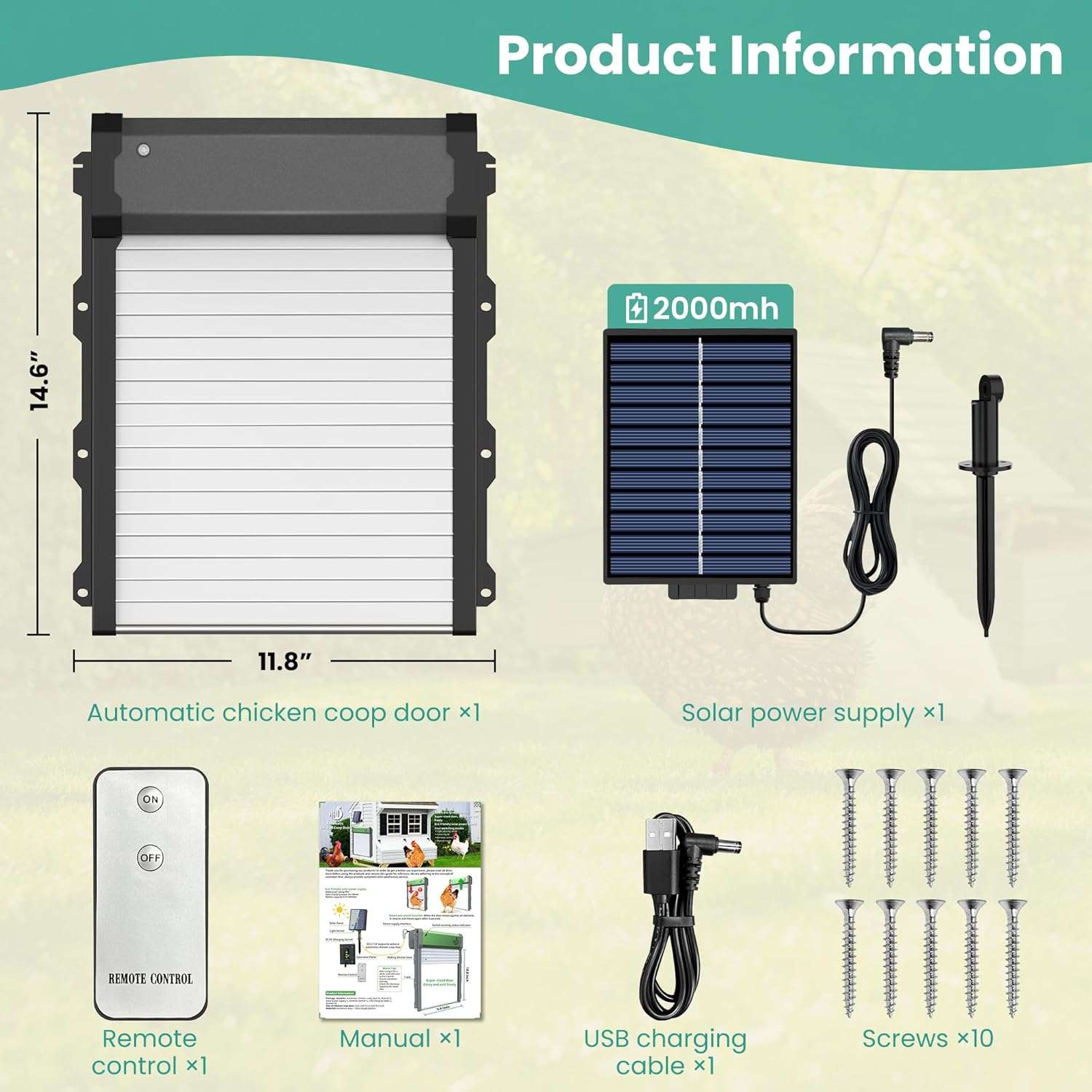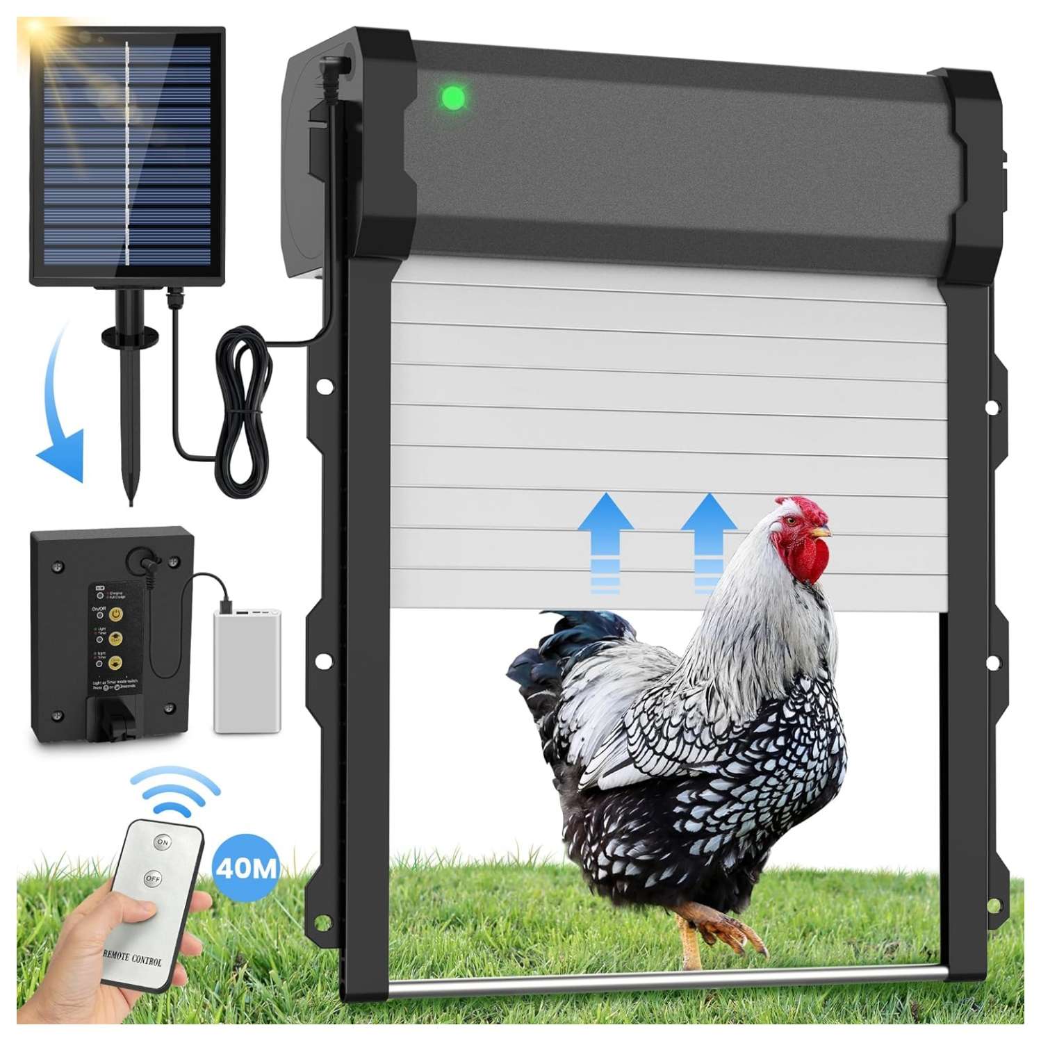 Simplifica la vida en tu parcela o granja con esta puerta automática robusta. Diseñada para quienes tienen un estilo de vida ocupado, este sistema se encarga de abrir y cerrar el gallinero puntualmente, manteniendo a tus aves seguras sin que tengas que estar presente.