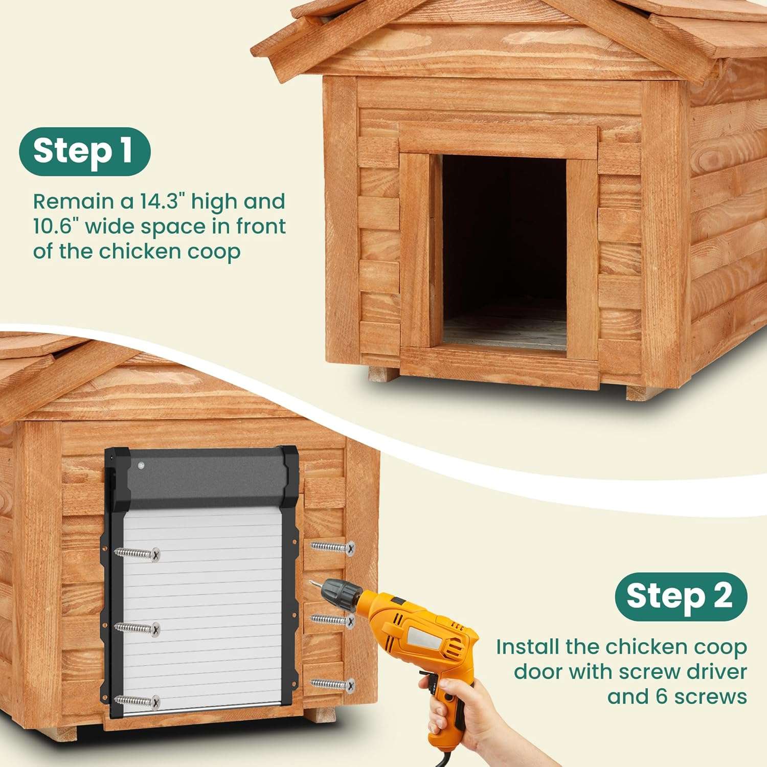 Instalación Rápida en 10 Minutos Olvídate de instalaciones complejas. El diseño permite montar la puerta en la pared exterior de tu gallinero en solo 10 minutos utilizando los tornillos incluidos. Es una solución rápida para mejorar la seguridad de tu corral.